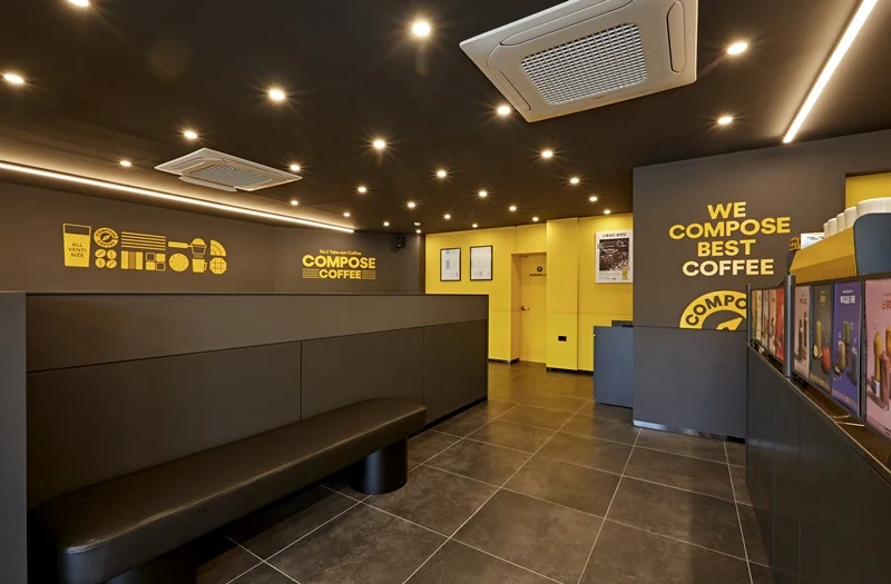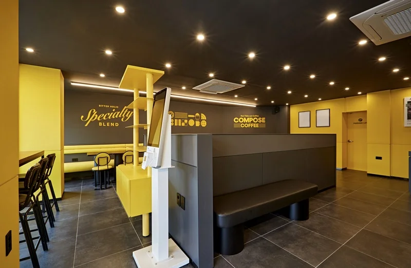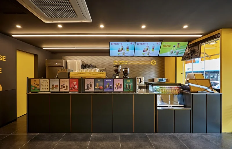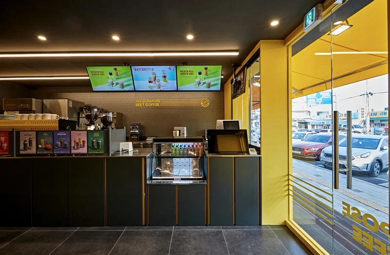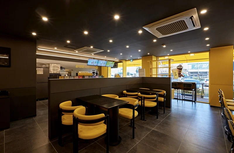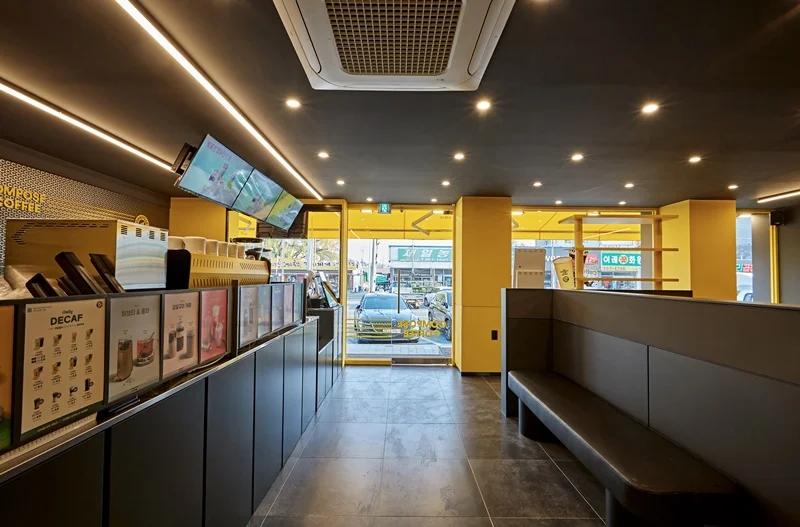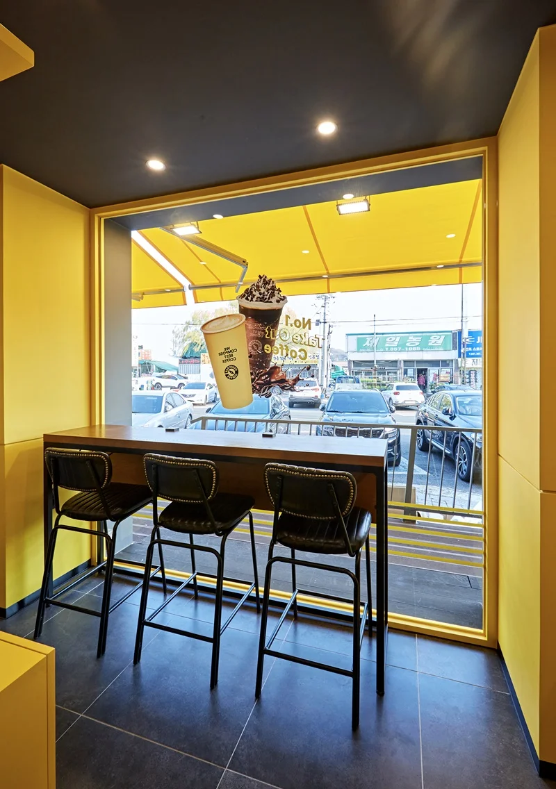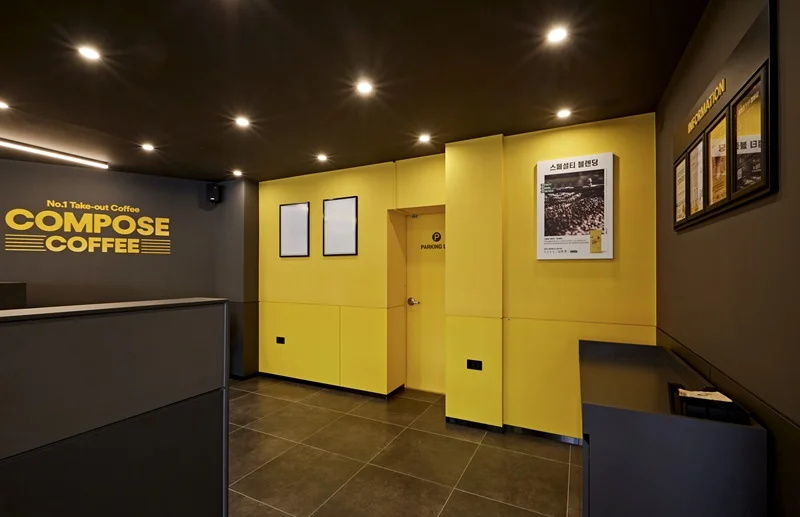 또한 입구 주변에는 노란색 조명과 무드등을 설치해 밤에도 눈에 잘 띄고, 은은한 분위기를 연출할 수 있도록 했습니다. 외부 포인트 컬러와 내부 인테리어가 자연스럽게 연결되며, 브랜드 통일성과 개방감을 동시에 확보한 사례로 평가받고 있습니다.