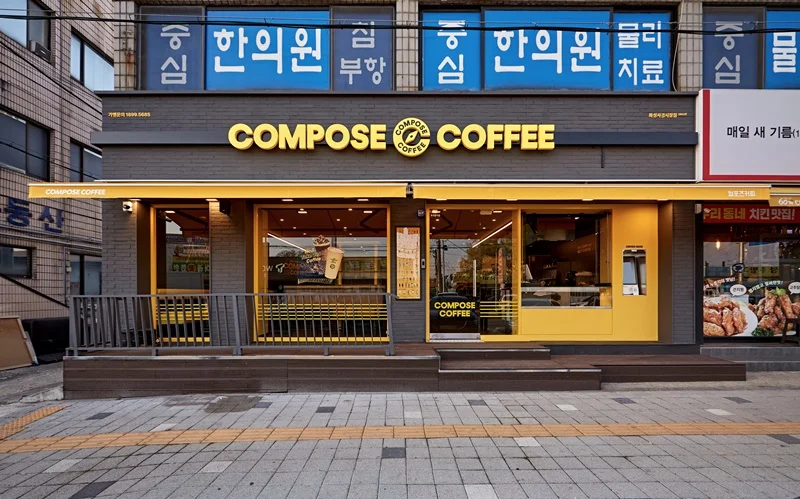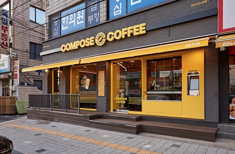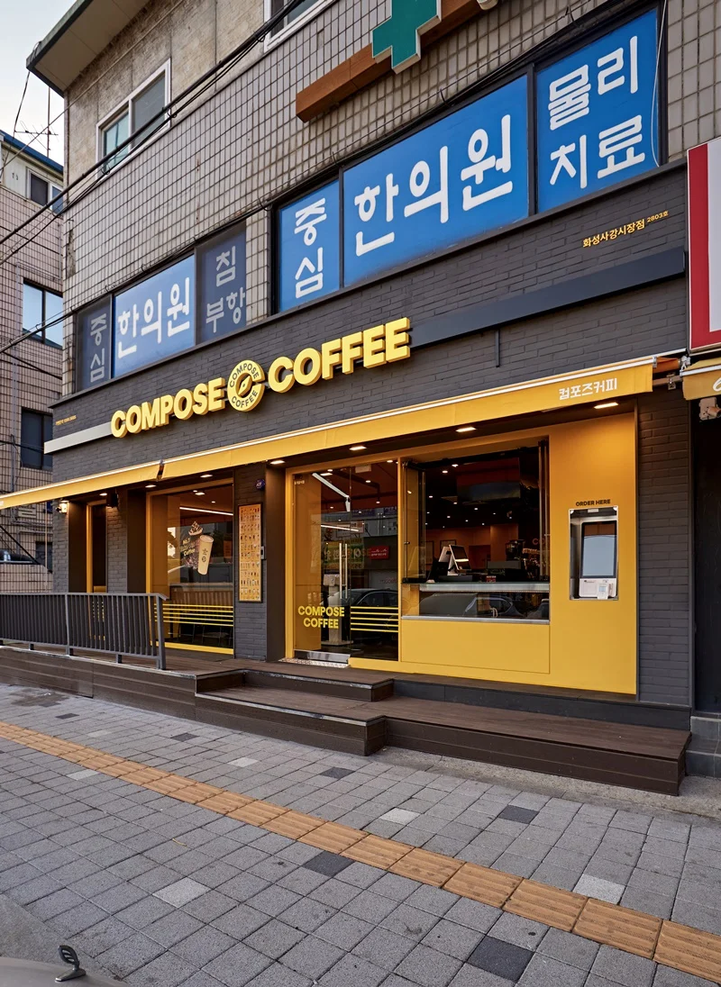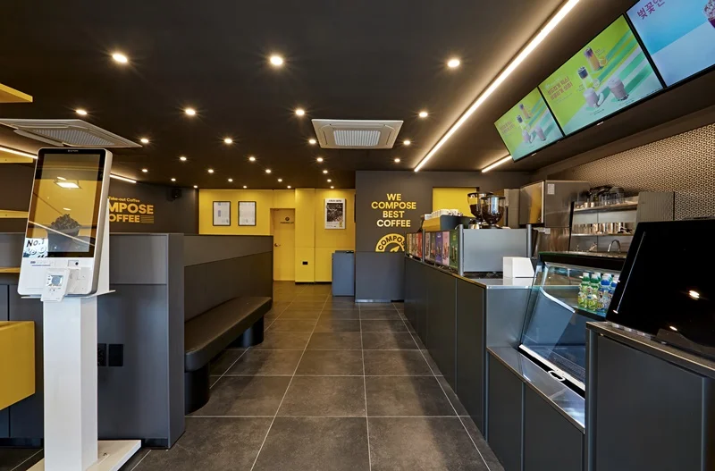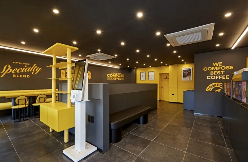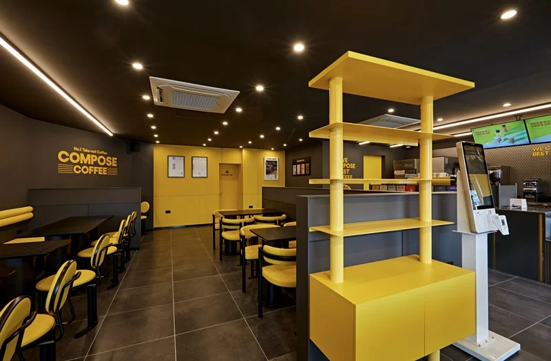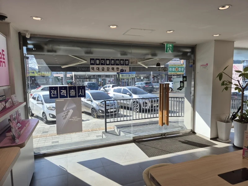 또한 입구 주변에는 노란색 조명과 무드등을 설치해 밤에도 눈에 잘 띄고, 은은한 분위기를 연출할 수 있도록 했습니다. 외부 포인트 컬러와 내부 인테리어가 자연스럽게 연결되며, 브랜드 통일성과 개방감을 동시에 확보한 사례로 평가받고 있습니다.