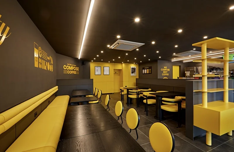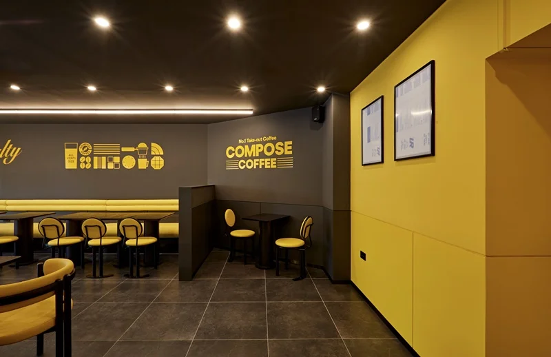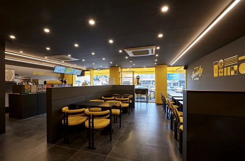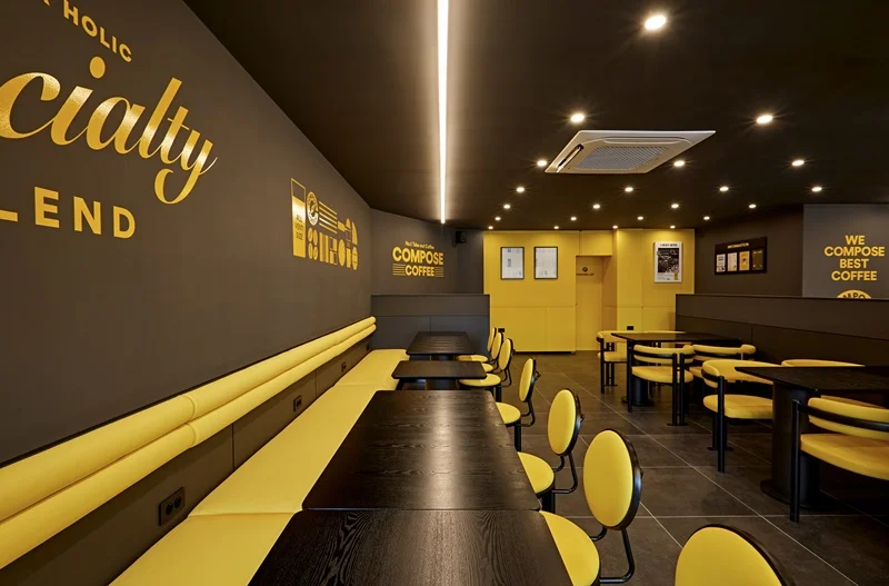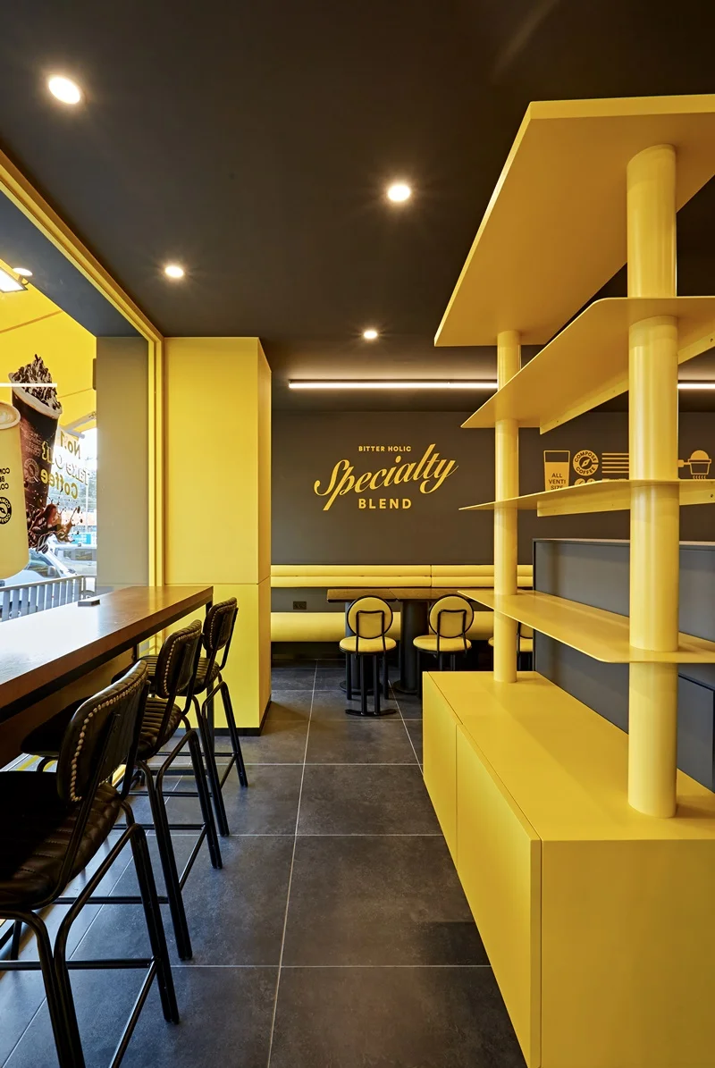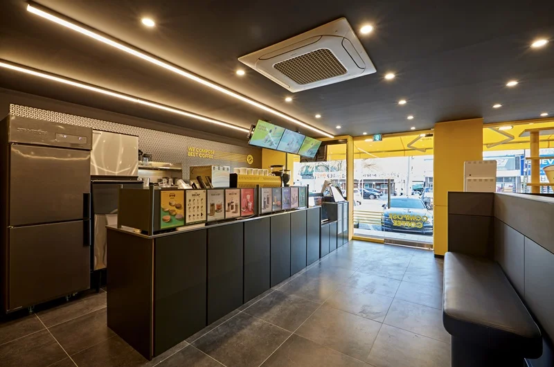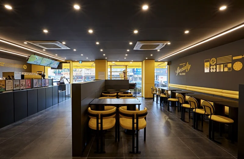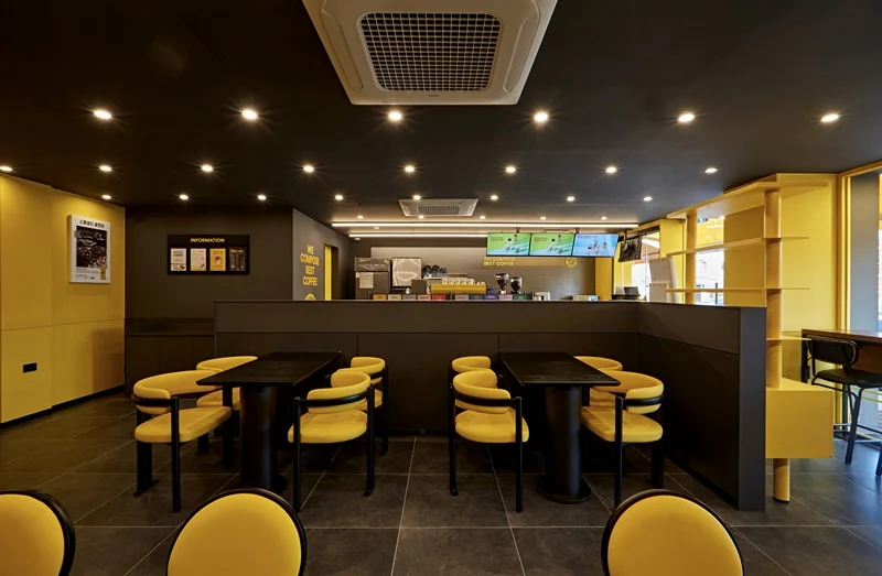 성남인테리어업체 카페는 모던한 블랙 컬러를 메인 베이스로 사용하는 브랜드로, 여기에 브랜드를 대표하는 노란색 포인트를 조명과 가구, 진열장, 소품 등에 활용해 생동감을 주는 것이 특징입니다.