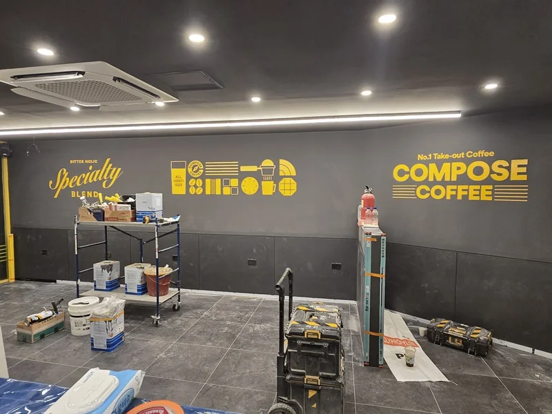 외부 디자인은 매장 방문객의 첫인상을 좌우합니다. 이번 성남상가인테리어 카페 체임점 공사에서는 블랙 알루미늄 복합판넬로 파사드를 시공하고, 브랜드 로고 사인물을 전면 상단에 설치해 멀리서도 한눈에 매장을 인지할 수 있도록 디자인했습니다.