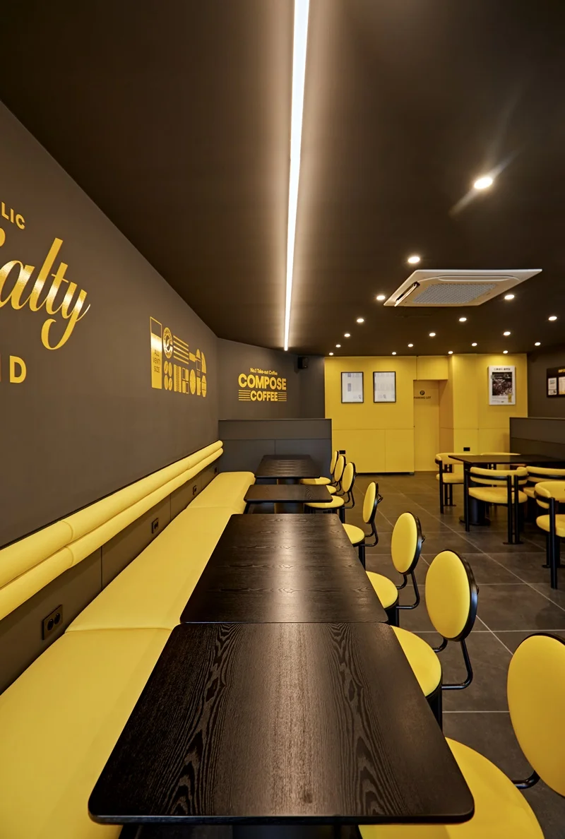 이번 인테리어에서는 천장, 몰딩, 바닥 마감, 창호 프레임까지 블랙톤으로 통일해 세련되고 안정감 있는 분위기를 조성했고, 벽면 간접조명과 진열장 내부 조명, 의자, 쿠션, 안내판 등에 노란색 포인트를 배치하여 브랜드 아이덴티티를 자연스럽게 노출시켰습니다.