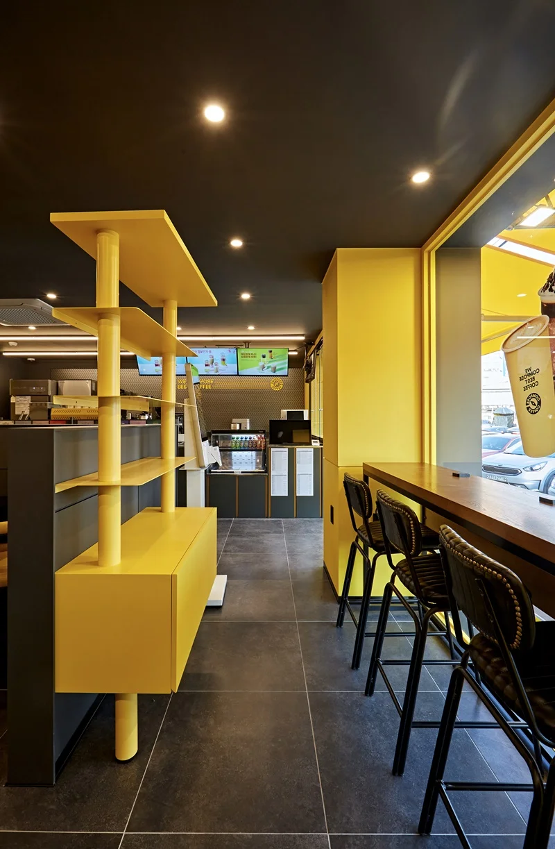 또한, 진열장은 오픈형 옐로우 프레임과 선반으로 제작해 제품 진열의 효율성과 인테리어 효과를 동시에 만족시켰습니다.