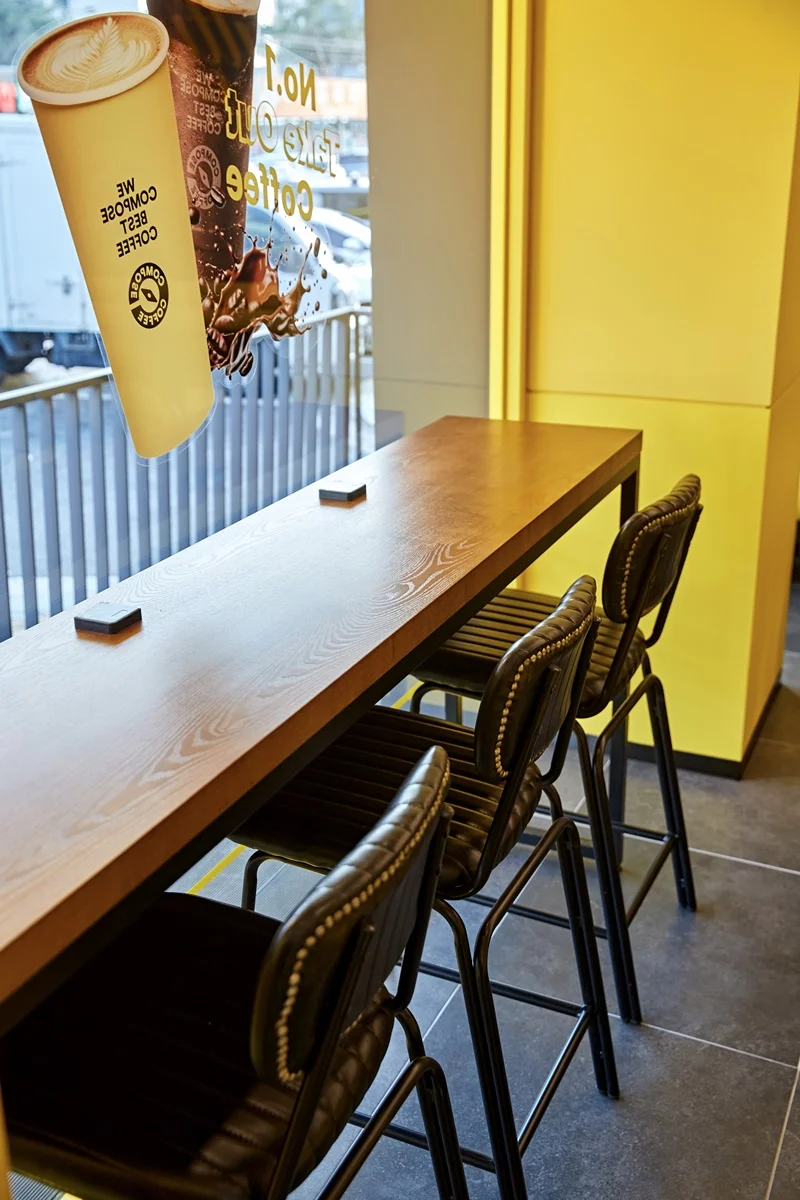 테이블과 체어 역시 블랙 프레임에 노란색 포인트 좌판으로 브랜드 아이덴티티를 반영했습니다.
