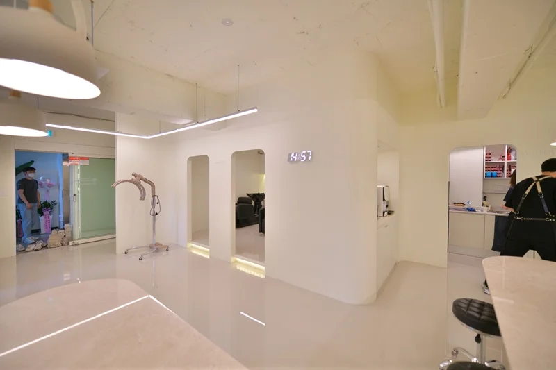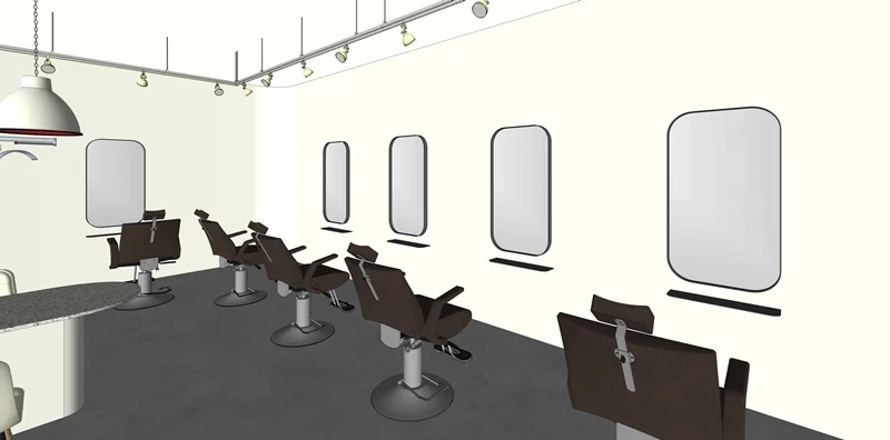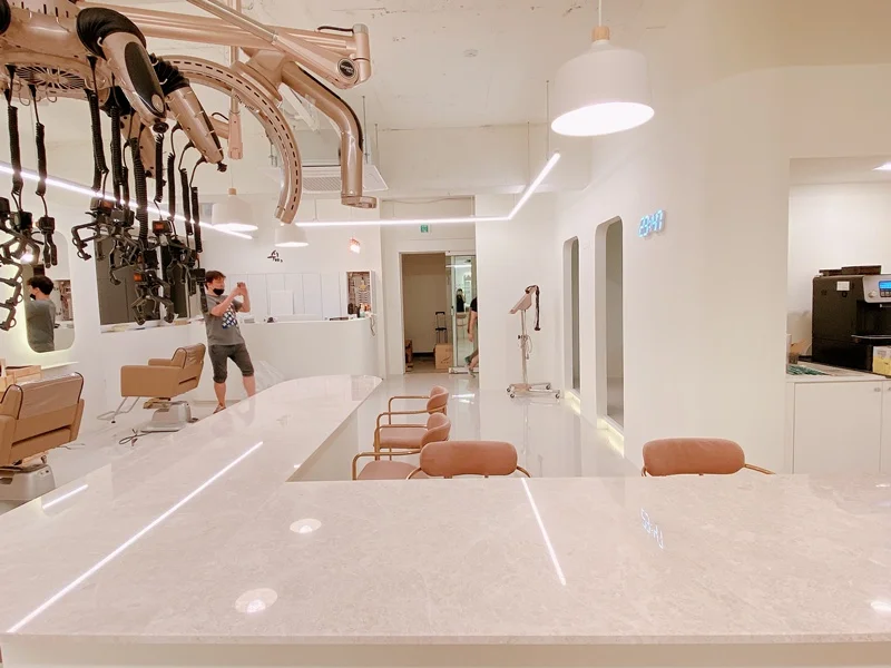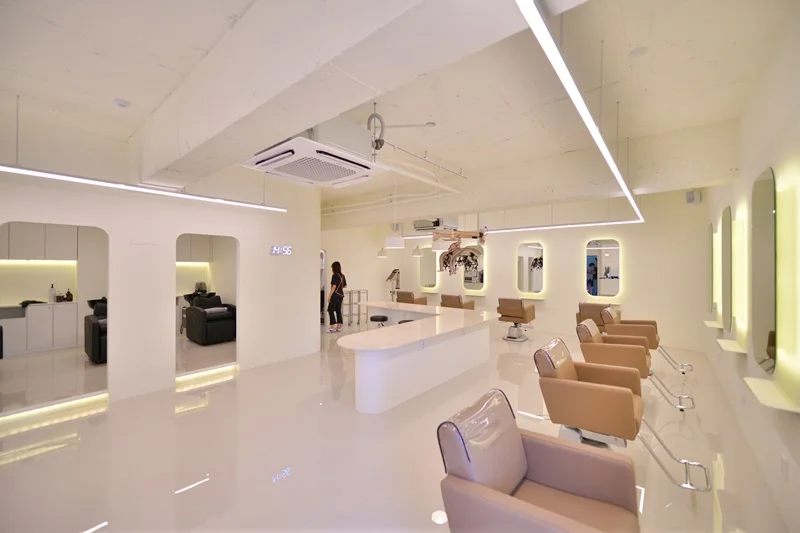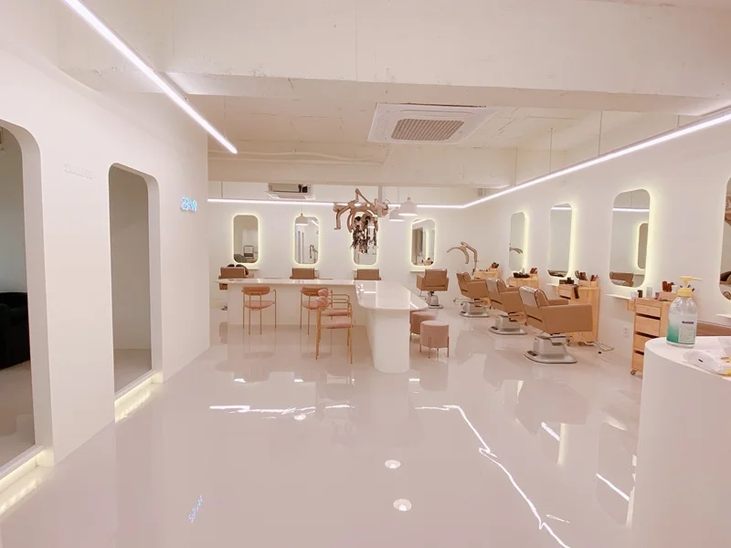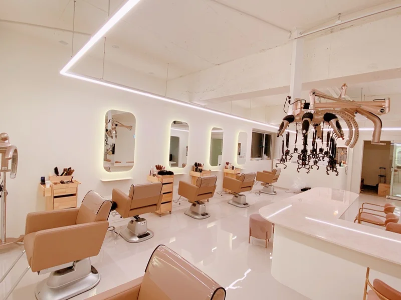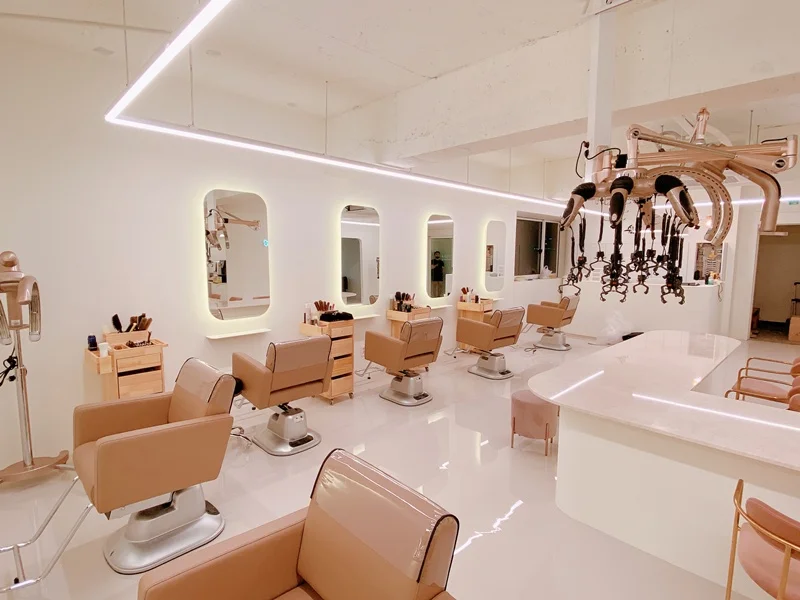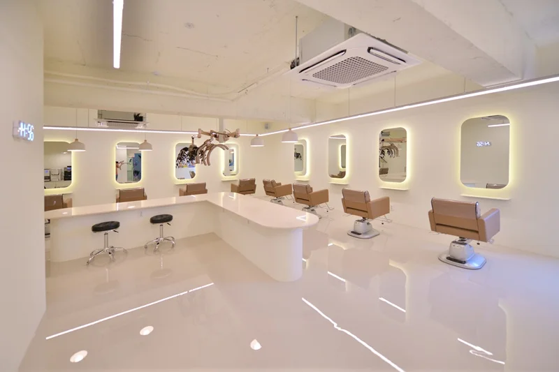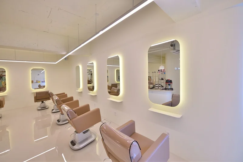 시술 공간은 미용실의 핵심으로, 경대 간 거리는 최소 1.2m 이상 확보하여 고객과 디자이너 모두에게 충분한 작업 공간을 제공해야 합니다. 거울 프레임이나 거울 뒤벽면에 간접 LED 조명 또는 라인조명을 넣어 거울 주위가 자연스럽게 밝아지면서, 고객 얼굴을 비춰줄 뿐 아니라 벽면 자체가 하나의 인테리어 요소가 됩니다. 이렇게 하면 거울 주변에 그림자가 생기지 않아 스타일링은 물론 셀카 촬영 시에도 매우 유리하답니다.