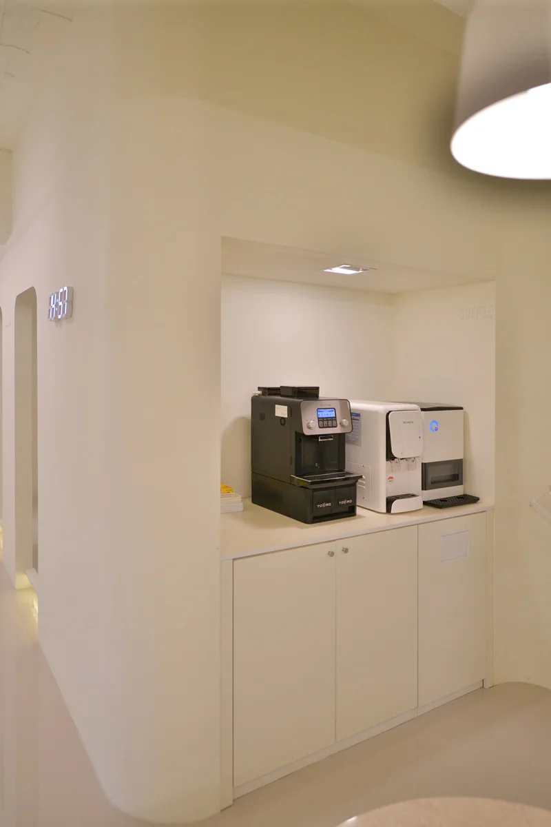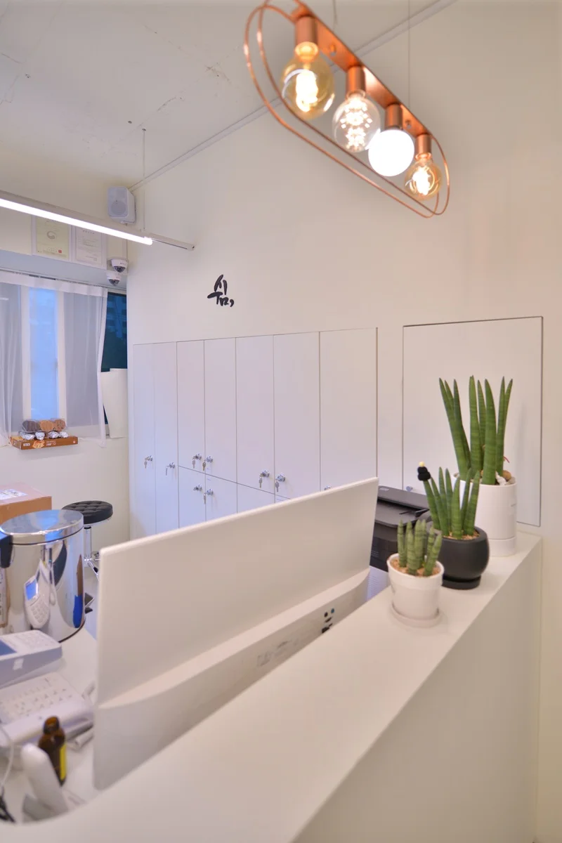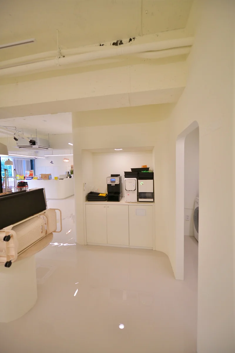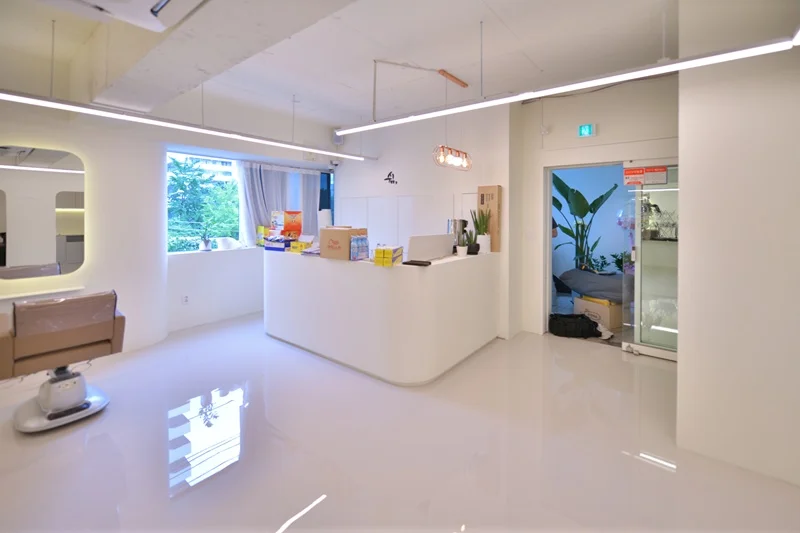 시흥인테리어업체 미용실의 리셉션 공간은 방문객이 가장 먼저 마주하는 공간이자, 예약 접수·대기·정보 제공 등 첫인상과 서비스 흐름이 시작되는 공간입니다. 그래서 특별히 구조와 형태에 신경을 많이 써서 완성하였습니다. ㄱ자 구조를 채택하여 공간이 단 한 장의 직선 카운터가 아닌 자연스러운 동선이 흐르는 구조가 되도록 하였습니다.