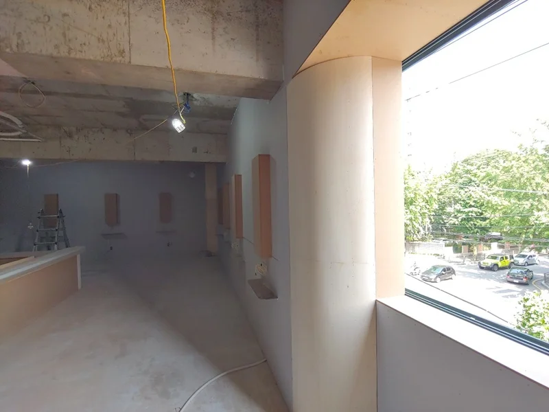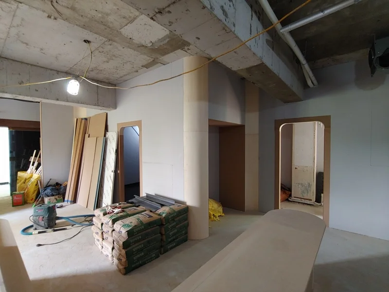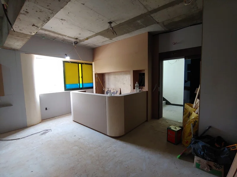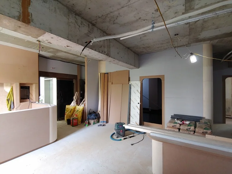 시흥상가인테리어 헤어샵 인테리어의 시공 현장입니다. 먼저 목공 공사는 공간의 골격을 잡고 기능구획과 디자인이 실제 물리적으로 구현되는 아주 핵심적인 단계입니다. 가장 먼저 공간 구획을 위한 가벽, 천장 박스, 혹은 구조용 프레임을 설치하는 것입니다. 리셉션, 시술존, 샴푸존, 대기공간 등 각기 다른 기능의 공간을 나누기 위해 천장부터 바닥까지 이어지는 프레임이나 벽면 마감체 설치가 필요합니다.
