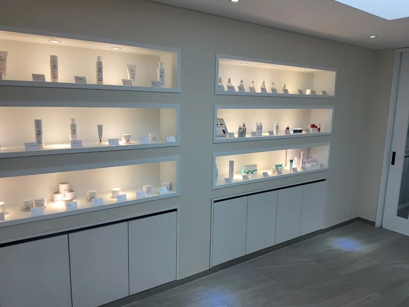 벽면 전체를 활용해 제작된 맞춤형 진열장은 기업의 주요 제품을 돋보이게 하는 역할을 합니다. 특히 선반에 매입된 LED 조명은 제품 하나하나를 밝히면서도 은은한 분위기를 자아내, 단순한 진열 공간이 아닌 고급 매장의 느낌을 전달합니다.