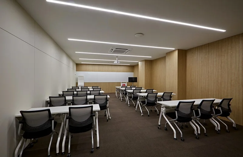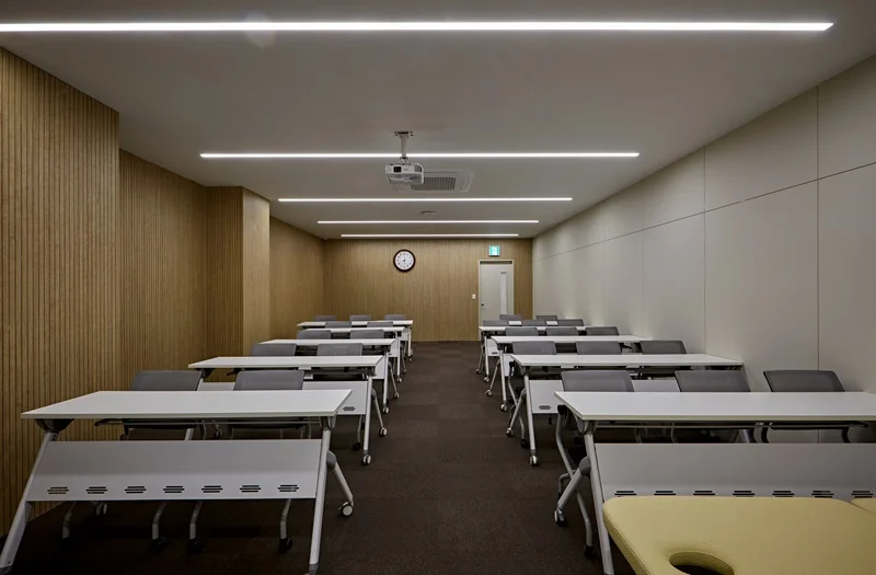 마지막으로 주목할 공간은 대형 강의실입니다. 기업 내부 직원 교육은 물론, 외부 손님을 초청한 세미나나 제품 설명회까지 다양하게 활용할 수 있도록 설계되었습니다. 넓은 공간감과 깔끔한 벽면 마감은 집중력을 높이는 효과를 주며, 조명은 강의 시 시야 확보에 용이하도록 밝고 균일하게 배치되었습니다. 또한 의자와 테이블은 이동이 용이한 가구를 선택하여 필요에 따라 배치와 구성을 자유롭게 변경할 수 있습니다.