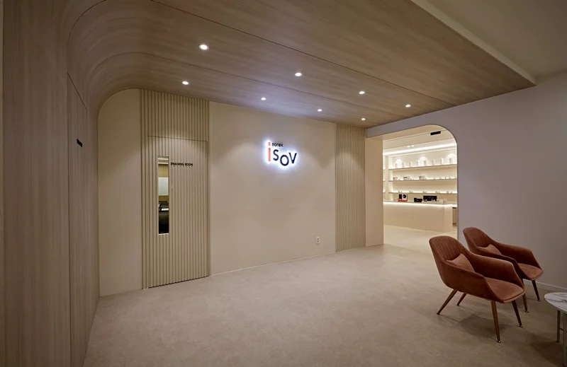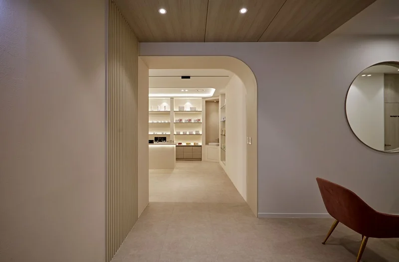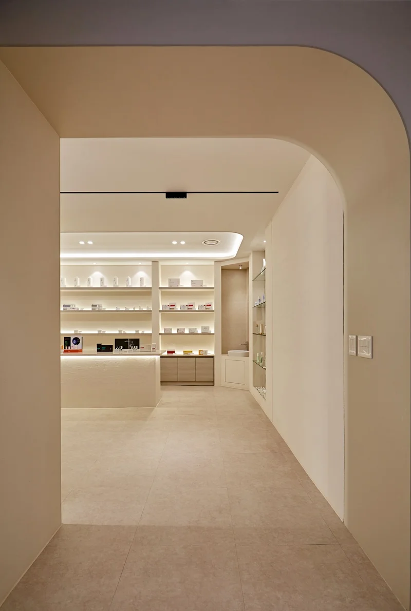 이번 인테리어의 가장 큰 포인트 공간은 바로 제품 진열 공간입니다. 아치형 입구를 지나면 펼쳐지는 이 공간은 기업의 브랜드를 가장 잘 보여줄 수 있는 상징적인 장소로 설계되었습니다.