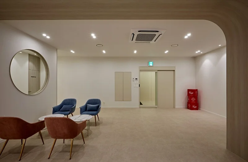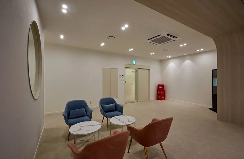 입구를 지나 로비에 들어서면 아늑하면서도 세련된 대기 및 휴게 공간이 펼쳐집니다. 손님을 맞이할 수 있도록 넉넉한 크기의 4인용 소파와 테이블을 배치하여 편안하게 대화할 수 있는 분위기를 조성했습니다.