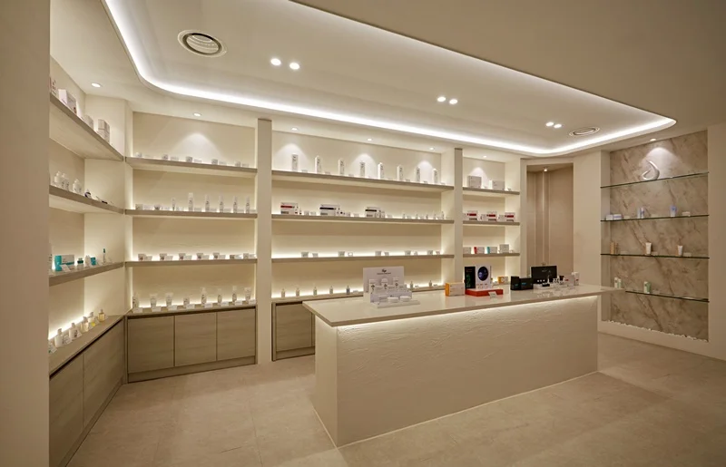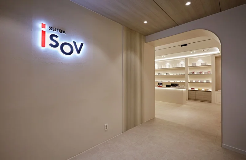 중앙에는 긴 전시 테이블을 배치해, 주요 제품을 체험하거나 가까이에서 확인할 수 있도록 했습니다. 이 공간은 단순히 제품을 전시하는 곳을 넘어서, 고객이 브랜드의 가치를 직접 체험할 수 있는 브랜드 아이덴티티 존이라고 할 수 있습니다.