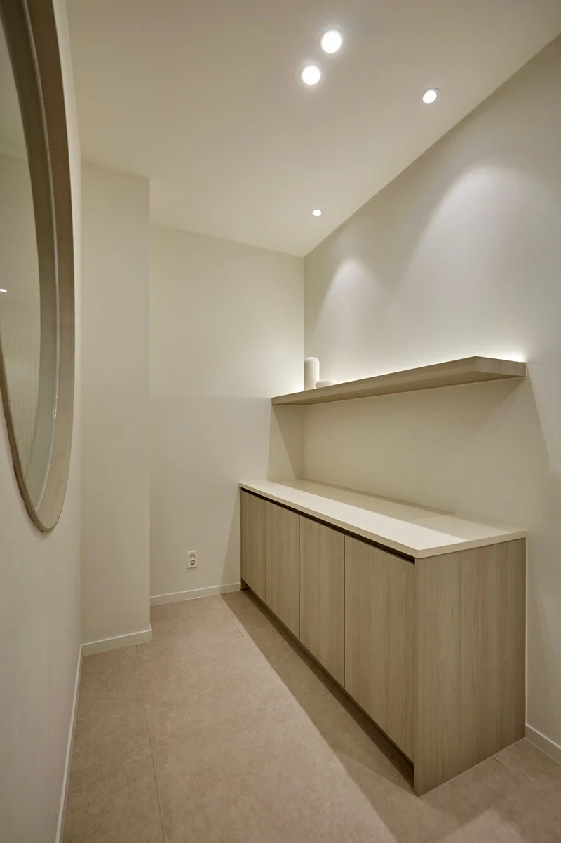 이제 공간에 생기를 불어넣는 조명 설치 단계입니다. 미리 준비된 배선에 맞추어 다운라이트, 간접조명, 스포트 조명을 하나씩 배치했습니다. 은은하게 빛을 퍼뜨리는 간접조명은 따뜻한 분위기를 연출하고, 포인트 스폿 조명은 주요 오브제나 벽면을 강조해 입체적인 공간감을 살렸습니다. 라인 조명은 현대적인 감각을 더해 세련된 분위기를 완성했습니다.