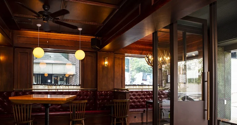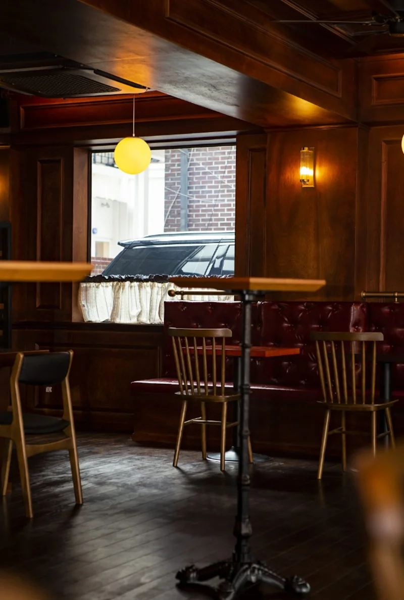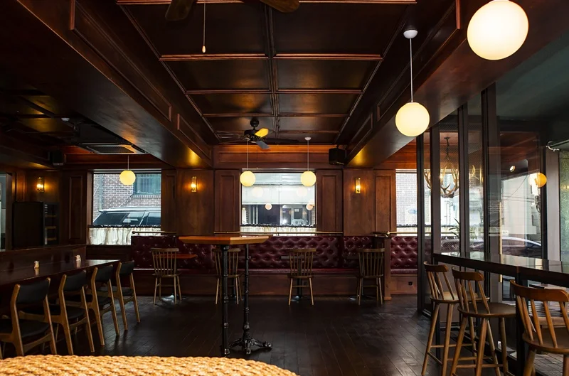 이자카야 인테리어의 핵심은 가구입니다. 이번 프로젝트에서는 짙은 우드 컬러의 가구와 포인트를 적절히 조합해 세련된 감성을 표현했습니다. 바 테이블은 원목 상판 결합한 구조로, 시간이 지나도 질리지 않는 고급스러움을 보여줍니다. 좌석은 인체공학적 설계로 착석감이 좋은 하이체어를 선택해, 편안하면서도 바 공간의 분위기를 해치지 않도록 했습니다.
