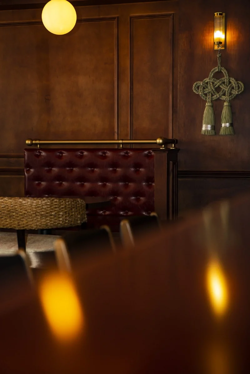 벽면은 고급스러운 질감의 짙은 월넛 계열 무늬목으로 마감했으며, 수평결의 나뭇결이 공간의 안정감을 더해줍니다. 벽면 중간에는 일본식 나무 파티션을 부분적으로 설치해 공간이 완전히 막히지 않으면서도 시각적으로 영역이 구분되도록 구성했습니다.