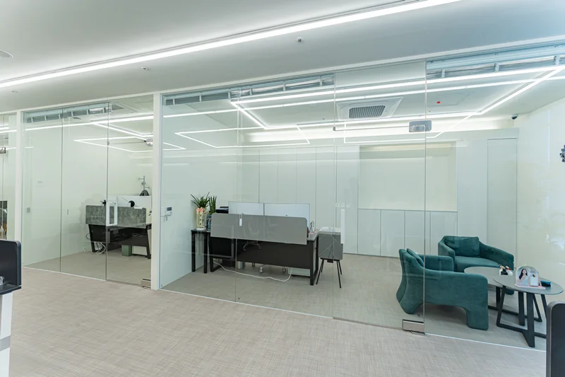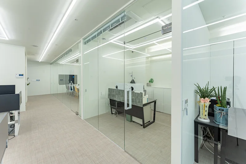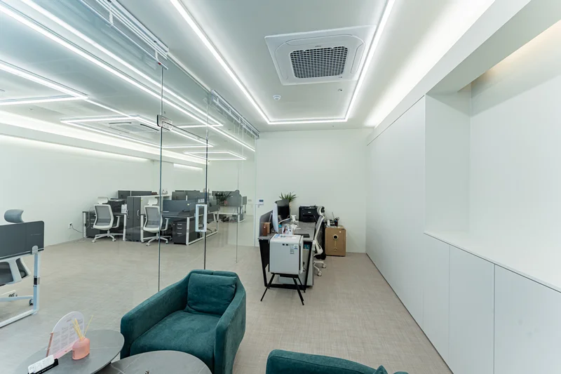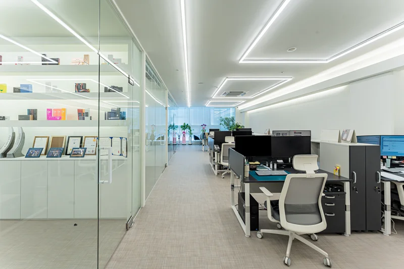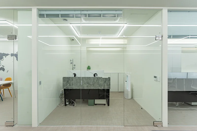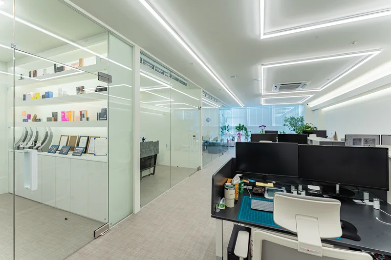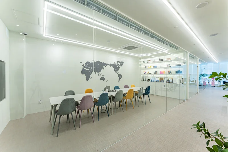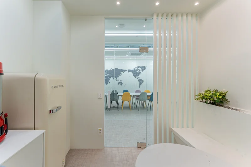 이러한 유리가벽 디자인은 공간을 넓어 보이게 하는 효과와 함께 채광 효율도 극대화해 자연스러운 조명 분위기를 유지할 수 있어, 직원들의 업무 만족도 향상에도 크게 기여하고 있습니다.