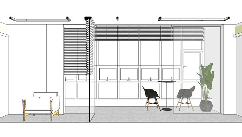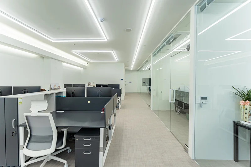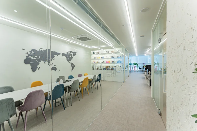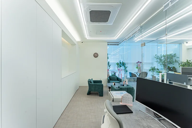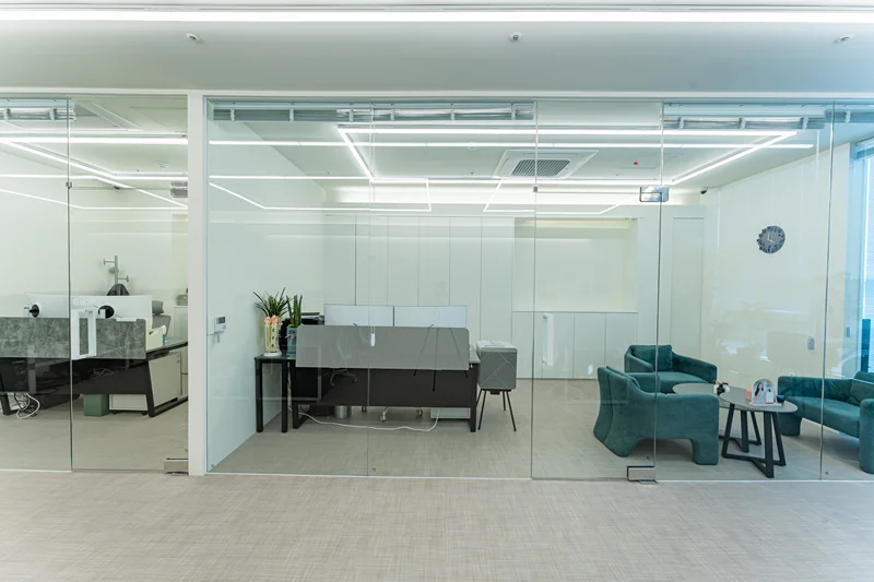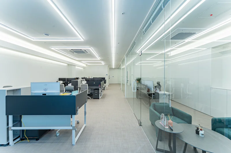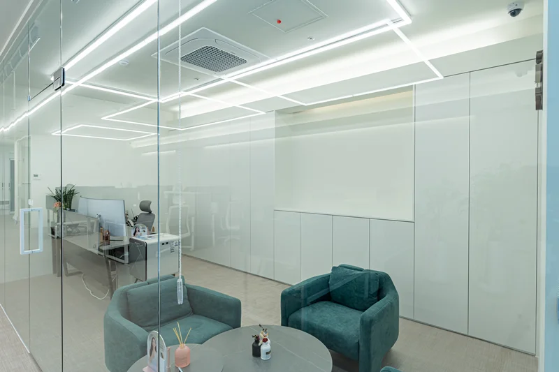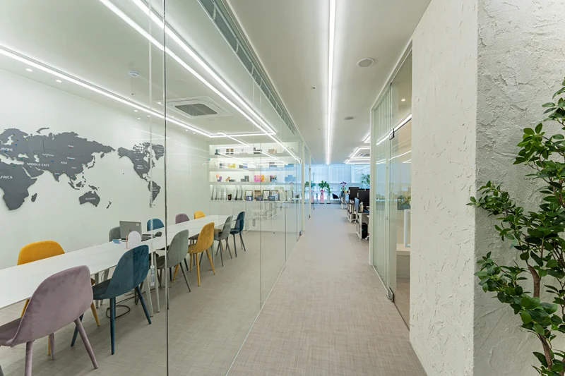 이러한 유리가벽 디자인은 공간을 넓어 보이게 하는 효과와 함께 채광 효율도 극대화해 자연스러운 조명 분위기를 유지할 수 있어, 직원들의 업무 만족도 향상에도 크게 기여하고 있습니다.