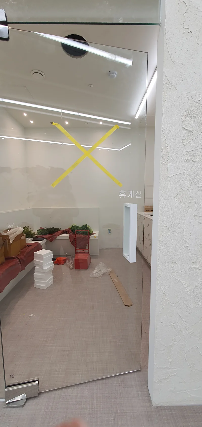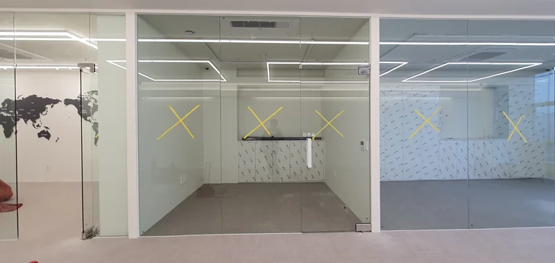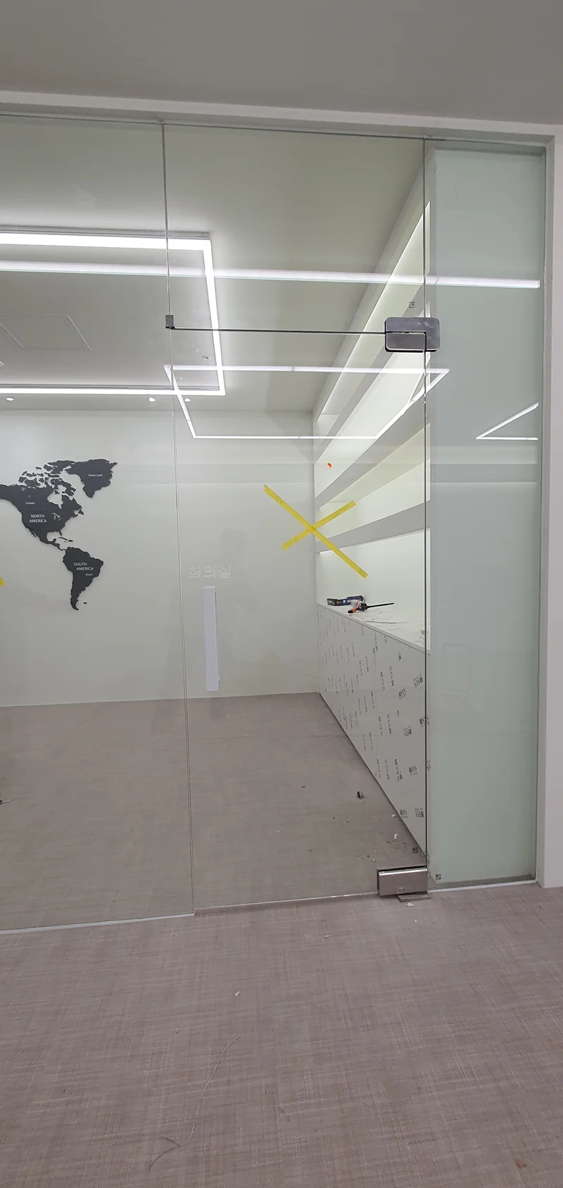 이번 프로젝트의 핵심 포인트 중 하나인 유리가벽 시공이 진행되었습니다. 유리가벽은 사전에 제작된 프레임에 맞춰 정밀하게 시공했으며, 안전을 위해 강화 유리를 사용해 튼튼함과 투명함을 동시에 확보했습니다. 유리가벽은 사생활 보호와 업무 집중력을 유지할 수 있도록 세심하게 마감했습니다.