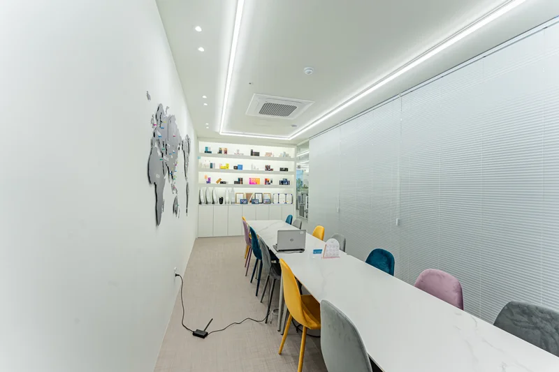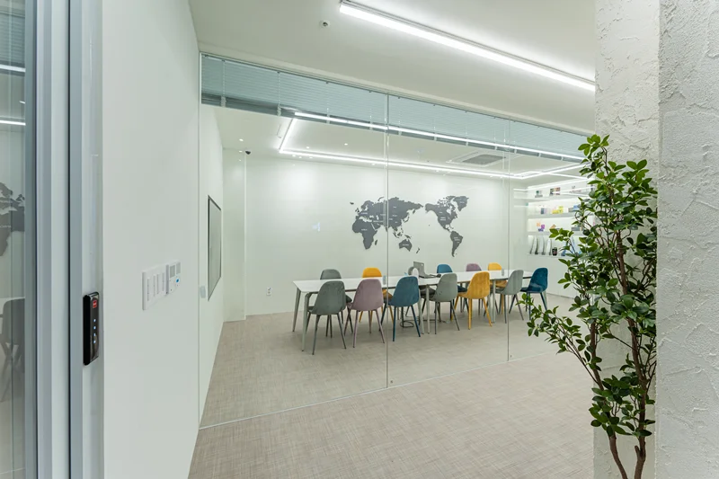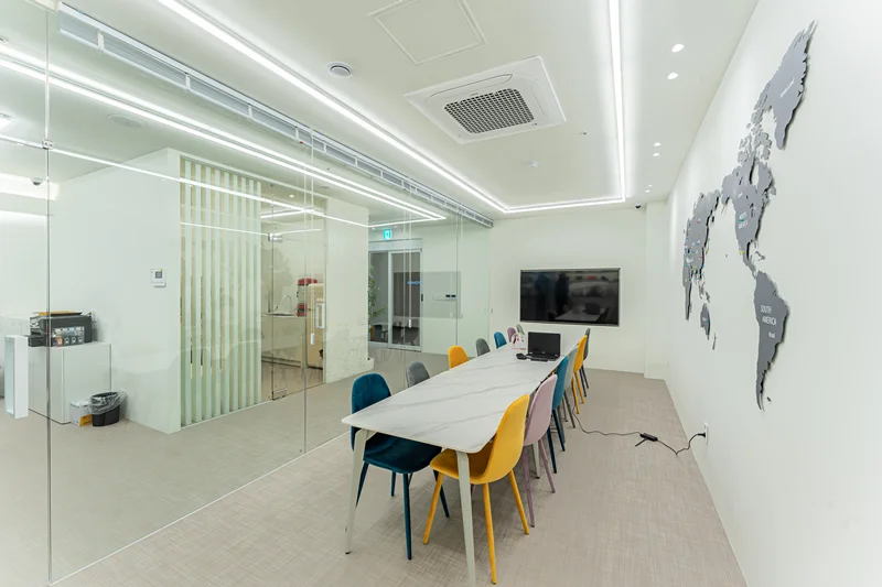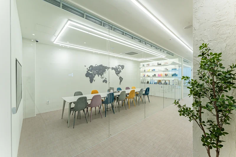 회의실 테이블은 화이트 상판과 다양한 컬러 체어 조합으로 생동감을 더했고, 천장에는 사각 라인 조명을 설치해 조명과 인테리어가 자연스럽게 어우러지도록 했습니다. 또한, 유리가벽으로 연결된 회의실 외부에서는 내부의 활동이 은은하게 보여져 업무의 투명성과 개방감을 느낄 수 있도록 구성했습니다.