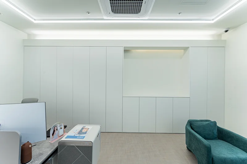 대표실 벽면에는 화이트 수납장을 설치해 공간의 활용성을 더하고, 간접조명을 활용해 심플하지만 감각적인 연출이 가능하도록 했습니다. 무엇보다 유리가벽을 통해 외부와의 시각적인 소통이 가능하면서, 필요 시 블라인드나 커튼으로 프라이버시도 확보할 수 있어 활용도가 높은 공간으로 완성되었습니다.