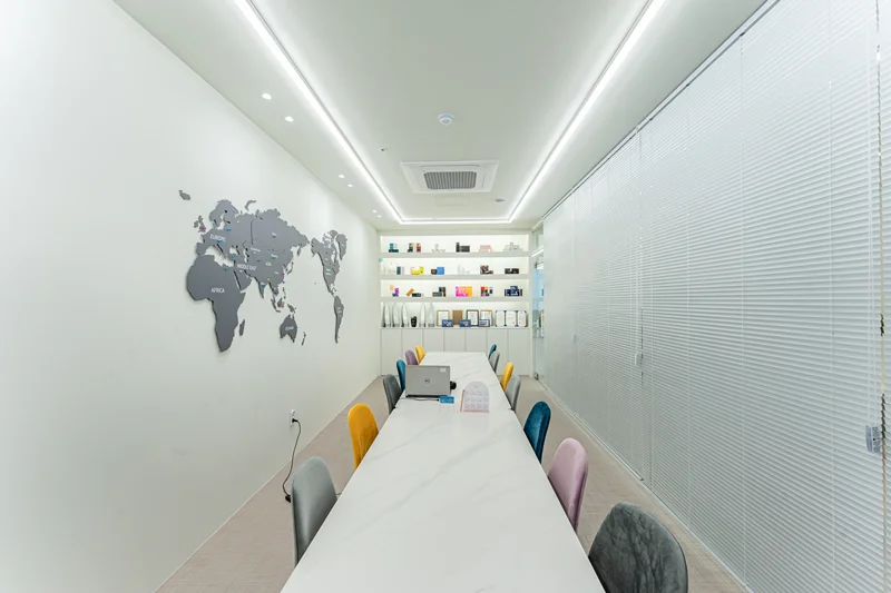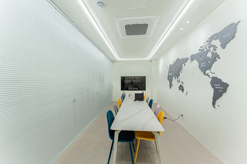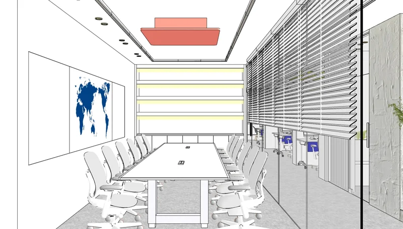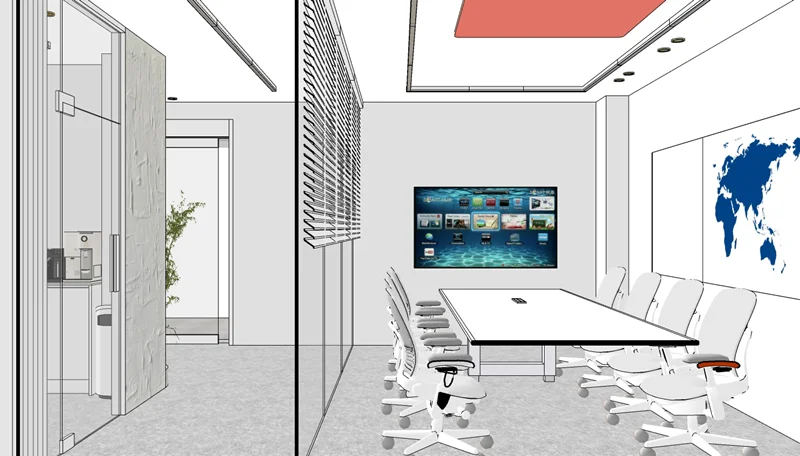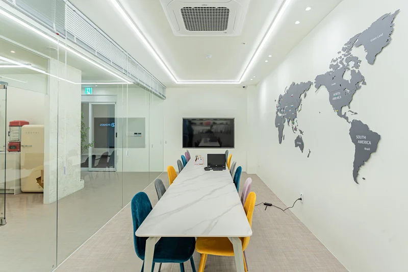 회의실은 회사의 비즈니스 비전과 정체성을 가장 잘 보여줄 수 있는 공간입니다. 이번 회의실 디자인에는 벽면에 대형 세계지도 아트월을 설치하여 글로벌 비즈니스를 지향하는 회사의 아이덴티티를 담았습니다. 화이트톤 월과 그레이 라인 아트로 표현된 지도 디자인은 심플하면서도 시선을 끄는 효과를 주며, 회의 중 자연스러운 아이스브레이킹 소재로도 활용됩니다.
