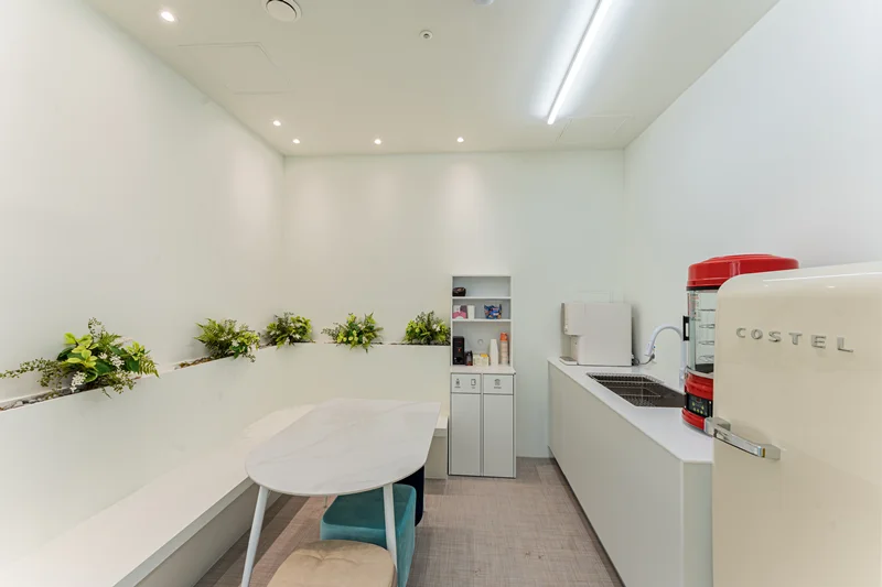 직원들의 휴식과 재충전을 위해 마련된 탕비공간은 밝고 편안한 분위기로 연출했습니다. 간살무늬 소재와 화이트 톤을 조화롭게 활용해 카페와 같은 느낌을 주었으며, 벽면에는 부드러운 웜톤 조명을 설치해 휴식 시 아늑함을 느낄 수 있도록 했습니다.