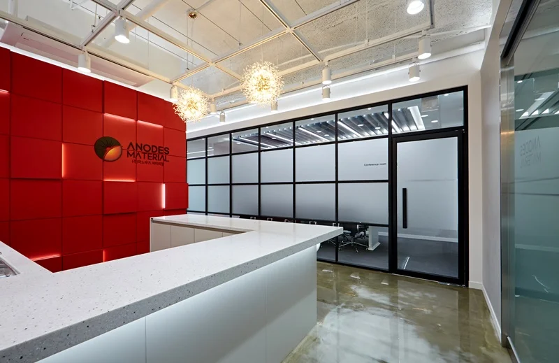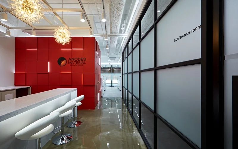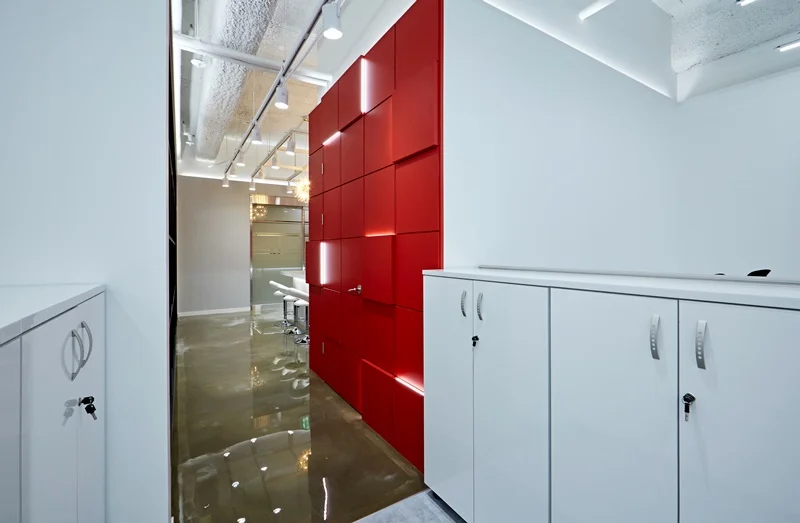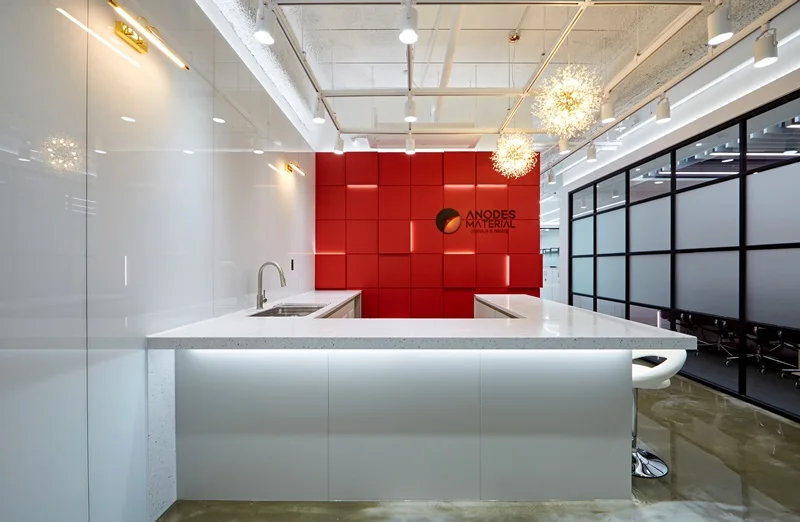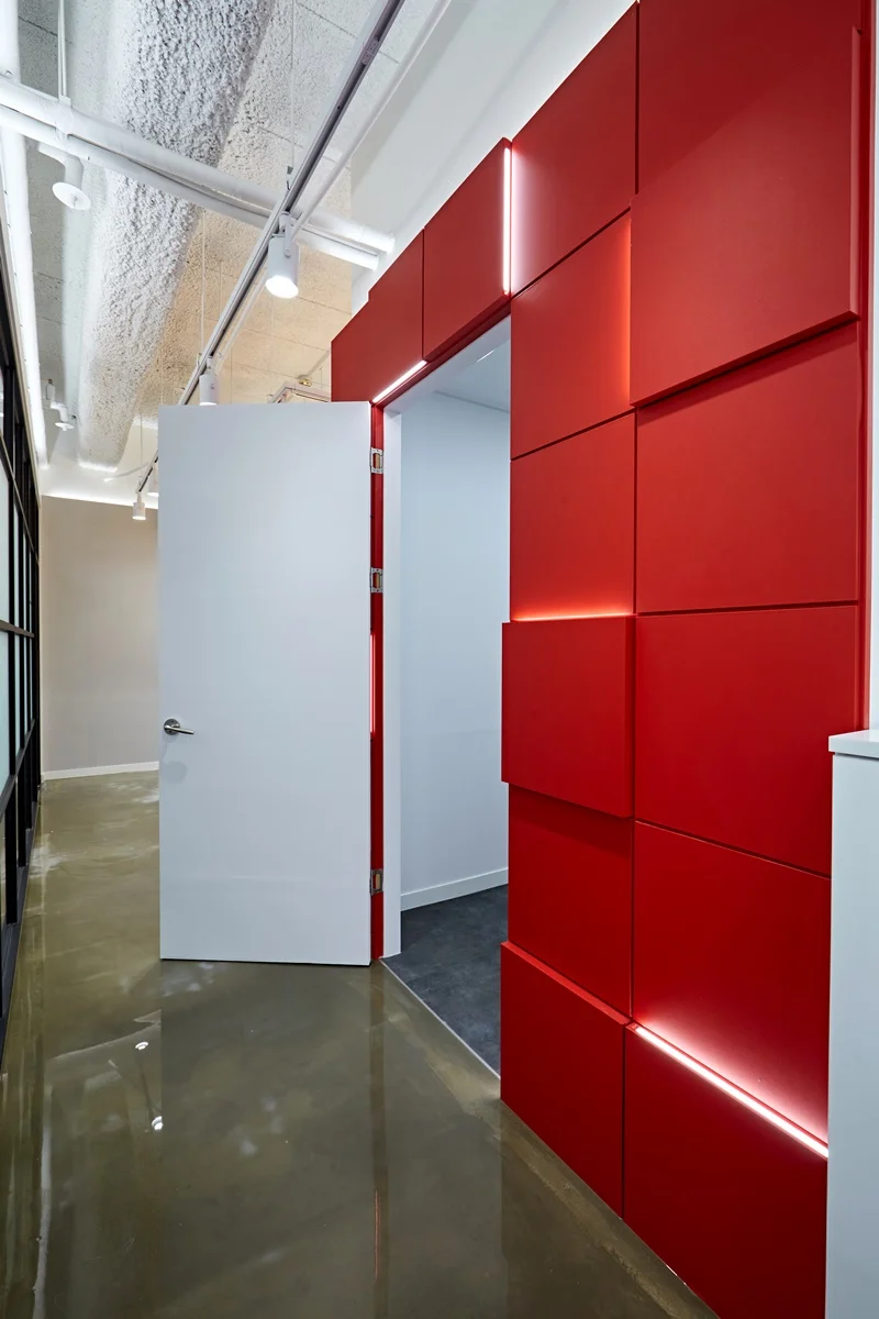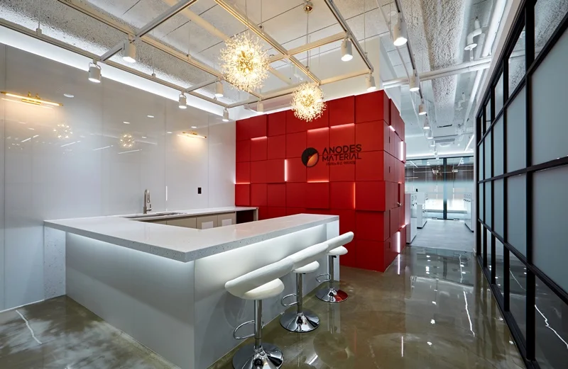 사무공간의 첫인상을 결정짓는 입구 벽면은 기업의 시그니처 컬러인 레드 컬러를 입체 벽면으로 시공하여 브랜드 아이덴티티를 강렬하게 표현했습니다. 벽면은 입체 패턴에 레드 컬러 마감을 적용해 단조로운 레드 컬러의 답답함을 없애고, 라인조명과 간접조명을 입체적으로 배치하여 공간의 깊이감과 볼륨감을 살렸습니다.