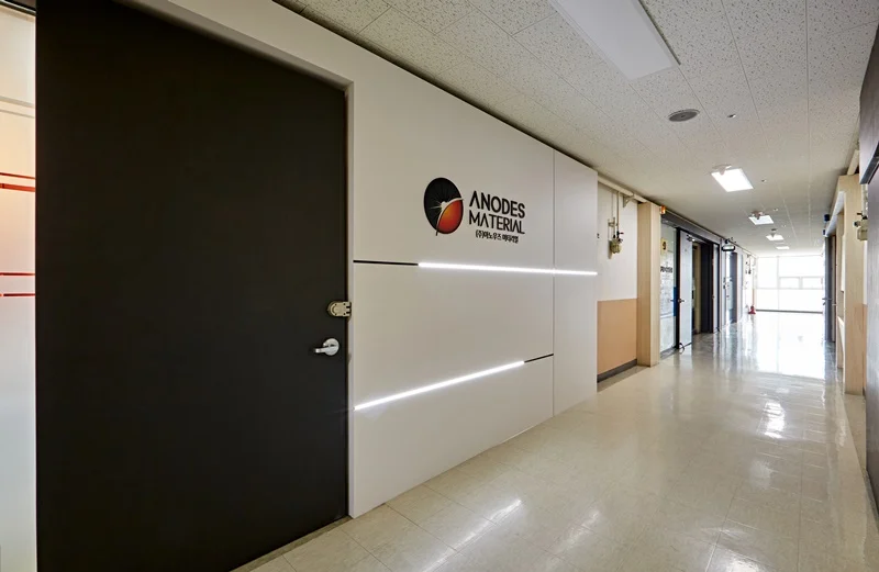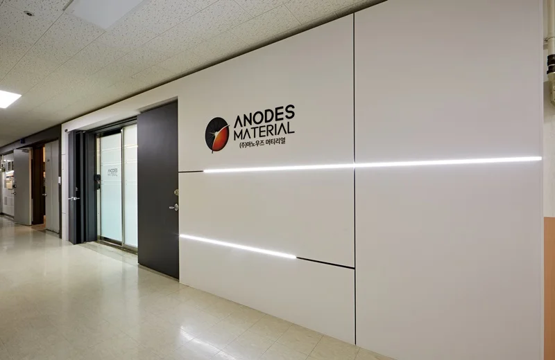 사무실 한가운데에는 레드 포인트 벽면으로 마감된 아트월이 공간의 중심 역할을 합니다. 심플한 화이트 벽면과 레드 벽면의 대비로 강한 인상을 주었으며, 벽면 중앙에는 기업 사인물을 설치해 브랜드 아이덴티티를 한층 강조했습니다.