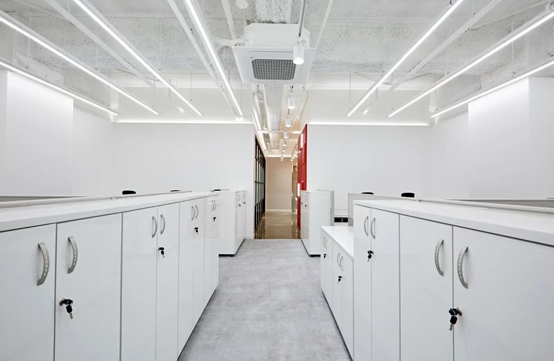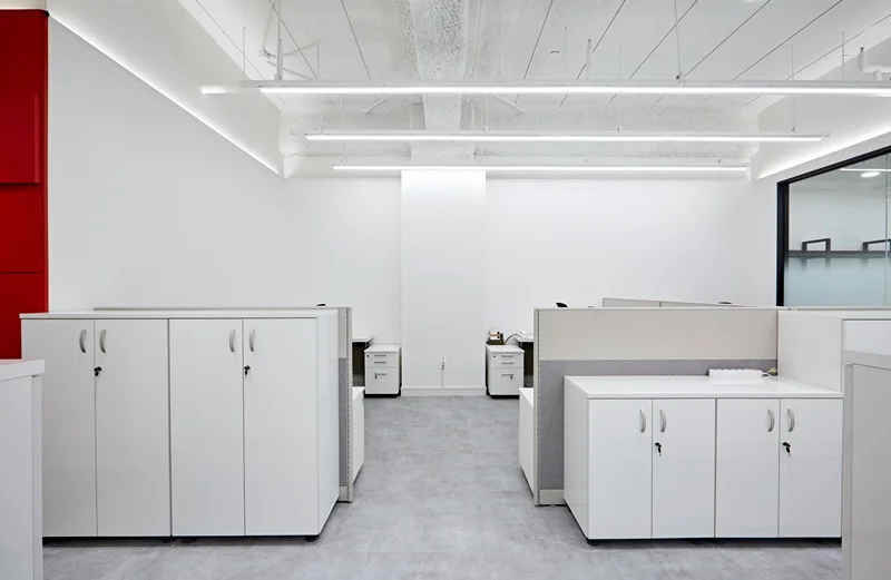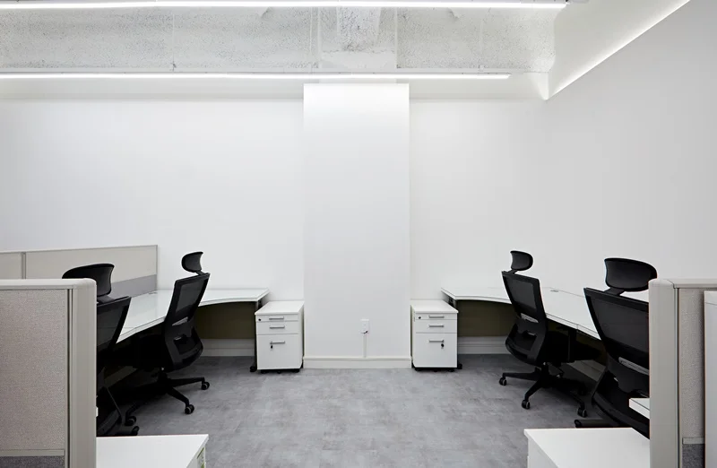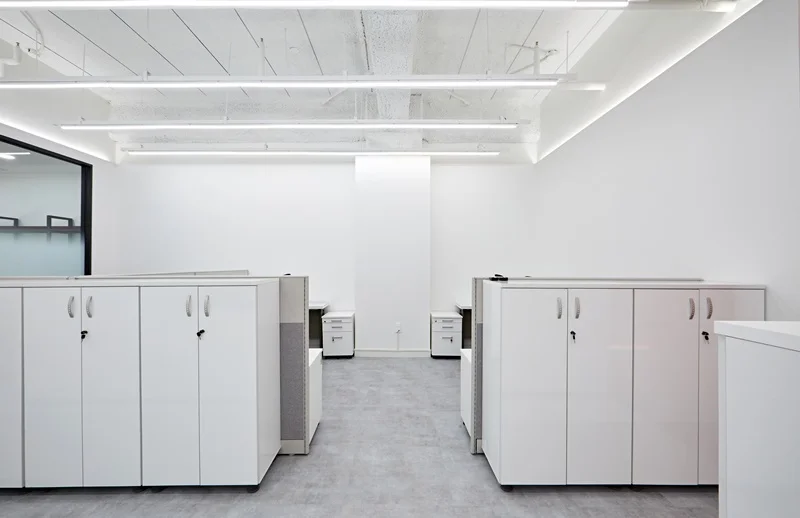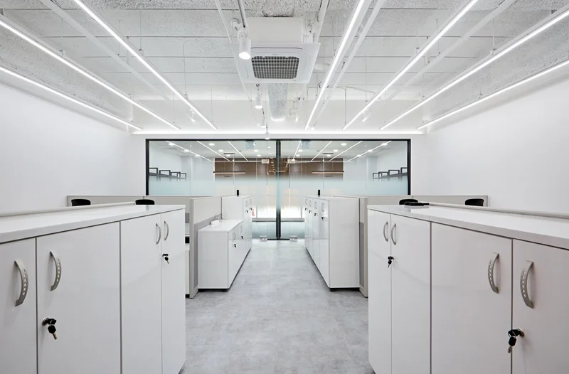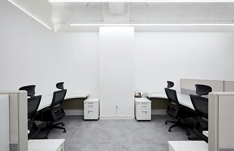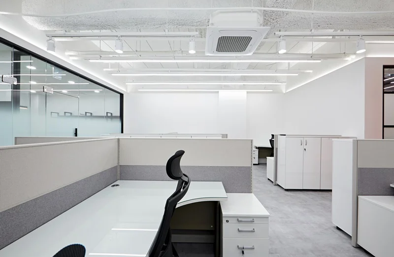 책상 배치는 라인형 배치와 독립형 데스크를 혼합해 팀별 특성과 업무 형태에 따라 유연하게 활용 가능하도록 설계했고, 천장에는 슬림 LED 조명과 라인 조명을 조화롭게 배치해 밝고 쾌적한 업무 환경을 조성했습니다.