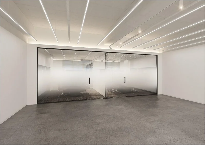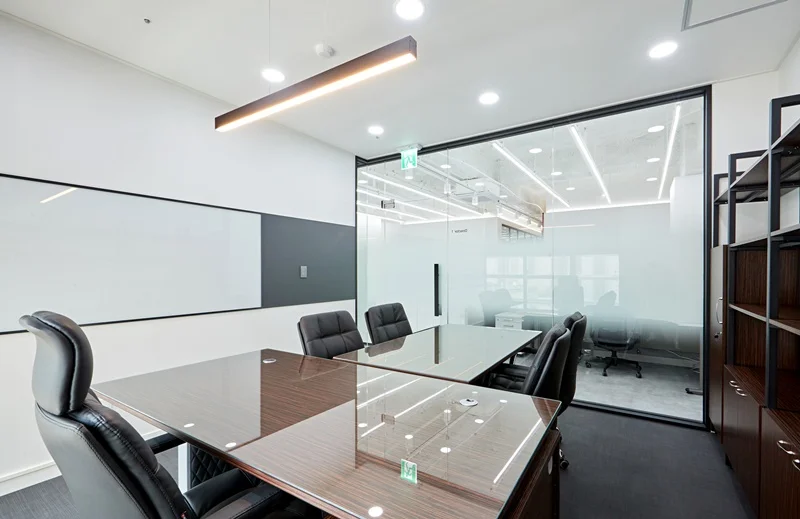 회의실 공간은 블랙 프레임 유리가벽 파티션으로 시공하여 외부에서 회의 진행 상황이 자연스럽게 보이도록 개방감을 확보하면서도, 시각적 경계를 명확히 나눴습니다.