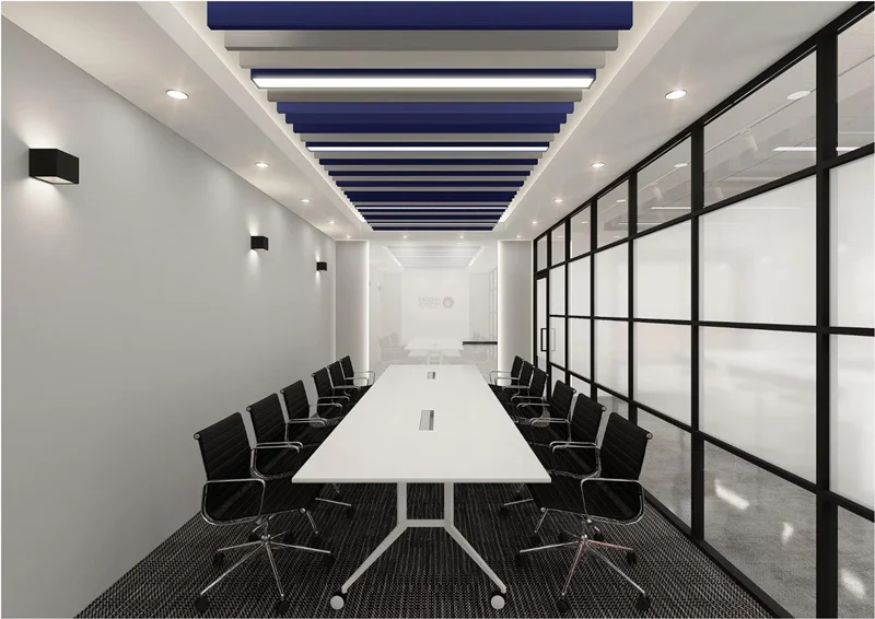 회의실 천장에는 블루 그라데이션 패턴의 펜던트 조명을 배치해 단조롭지 않은 조명 디자인으로 공간에 포인트를 더했습니다. 벽면에는 화이트 색상으로 회의에 집중할 수 있도록 했으며, 회의 테이블은 화이트 상판과 블랙 메탈 프레임 의자로 세련되고 실용적인 회의 공간으로 완성했습니다.