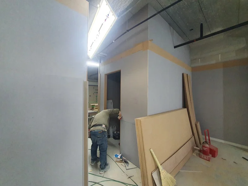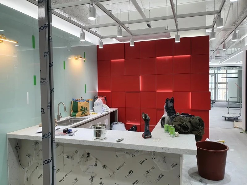 철거가 끝난 후에는 새로운 벽체와 아트월, 수납장 제작이 이어집니다. 입구 벽면에는 입체 벽면을 제작했고, 사무실 중앙에는 기업 로고가 들어가는 아트월을 설계해 공간의 중심 역할을 할 수 있도록 제작했습니다.
