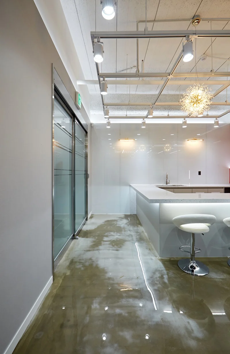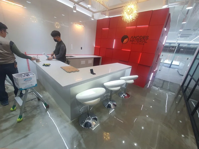 아트월 바로 앞에는 직원들과 내방객 모두가 편하게 이용할 수 있도록 ㄷ자 구조의 화이트 대리석 바 테이블을 제작해 카페테리아 공간을 구성했습니다. 화이트 천연 대리석 상판은 고급스러움과 위생성, 내구성을 동시에 만족시키며, 하부에는 은은한 LED 조명을 매립해 낮과 밤, 조명 환경에 따라 색다른 분위기를 연출할 수 있도록 했습니다.