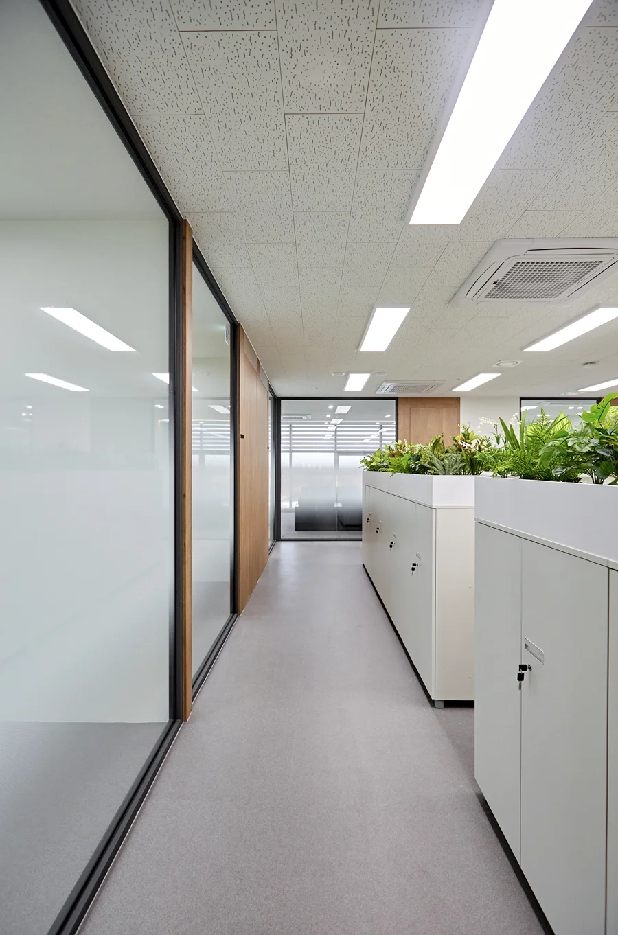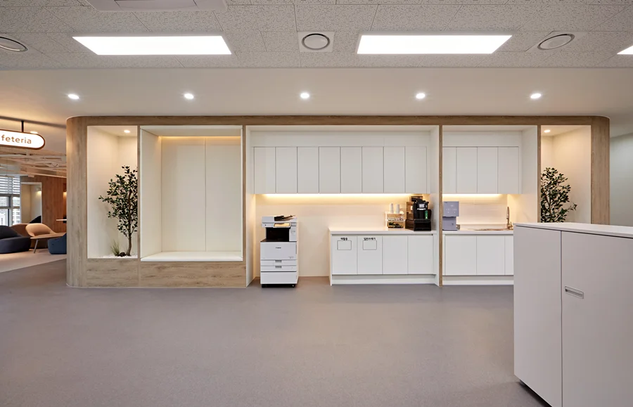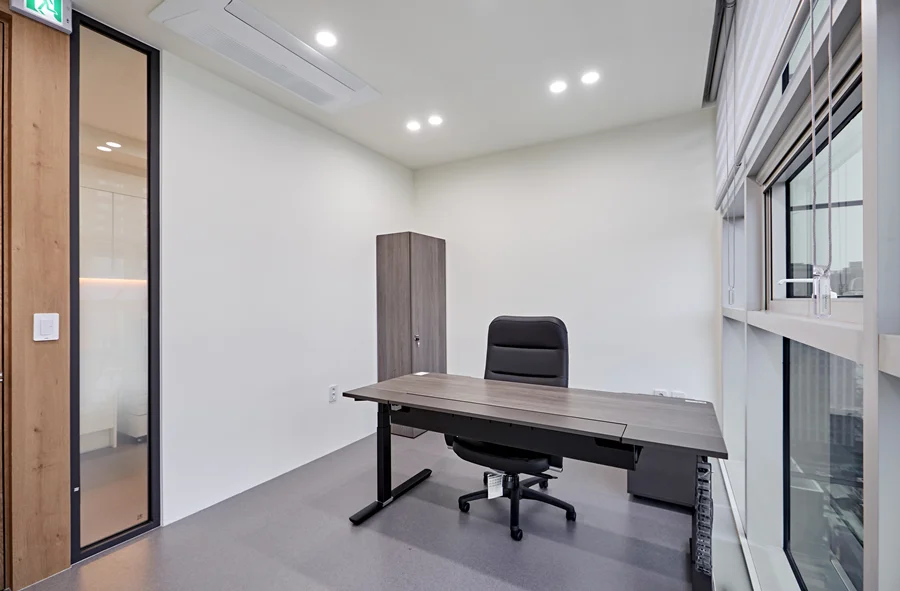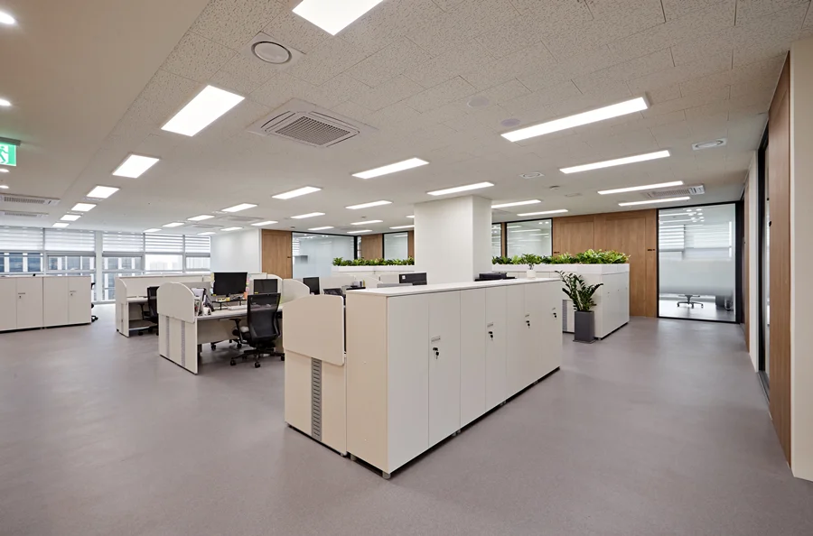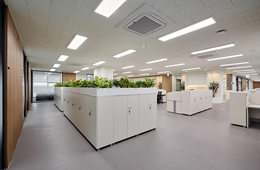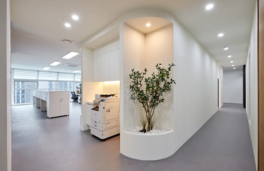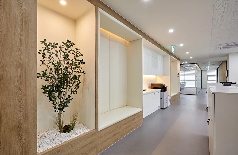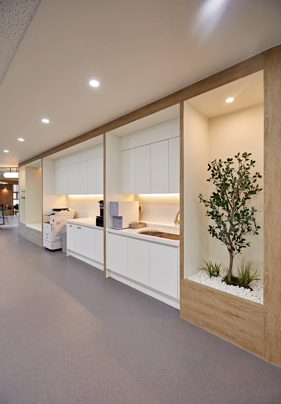 바닥재는 친환경 장판으로 깔끔하게 마감하고, 각 데스크 상단에는 라인 조명을 설치해 업무 효율성을 높였습니다. 공간 곳곳에 플랜테리어 요소를 배치해 쾌적하고 편안한 업무환경을 조성했으며, 우드 월패널과 유리 프레임의 조합으로 고급스러운 분위기를 연출했습니다.