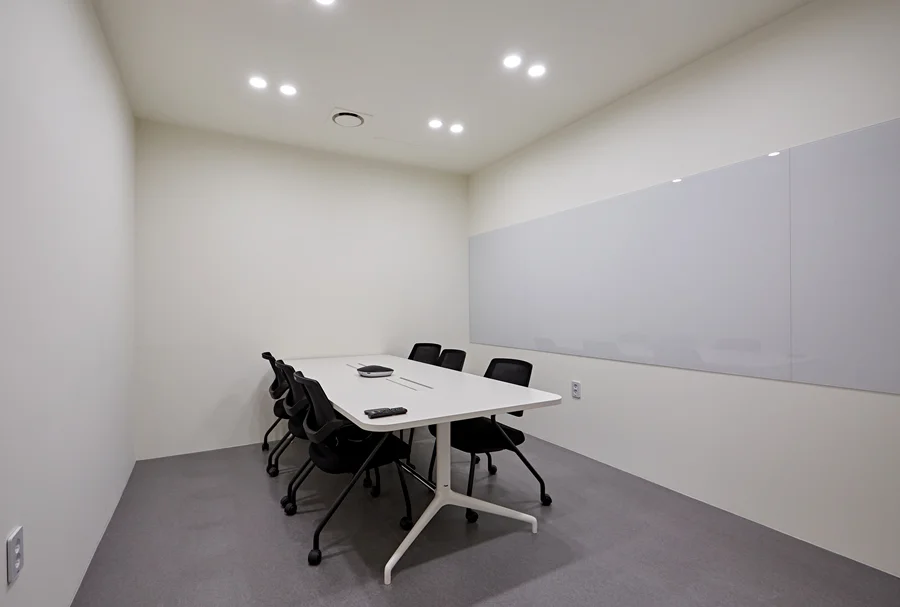 중앙에는 테이블과 인체공학 디자인의 메쉬 의자를 배치해 장시간 회의에도 쾌적하게 사용할 수 있도록 했으며, 벽면에는 화이트보드를 설치해 프레젠테이션에 최적화된 환경을 구축했습니다.