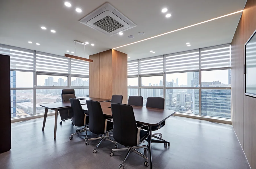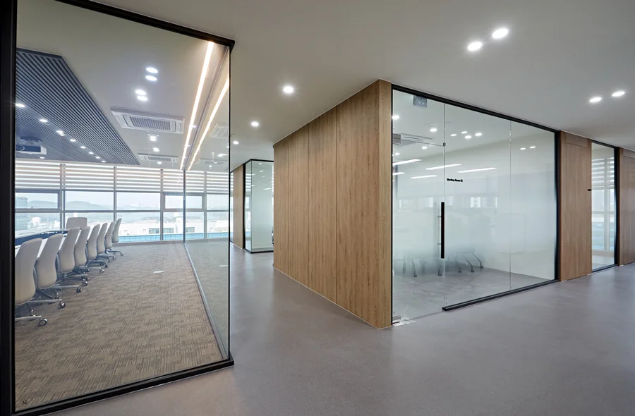 천장에는 다운라이트와 레일조명을 설치해 공간별 조명 조절이 가능하며, 특히 유리가벽을 통해 외부 자연광을 적절히 유입해 쾌적하고 밝은 회의 공간을 구현했습니다.