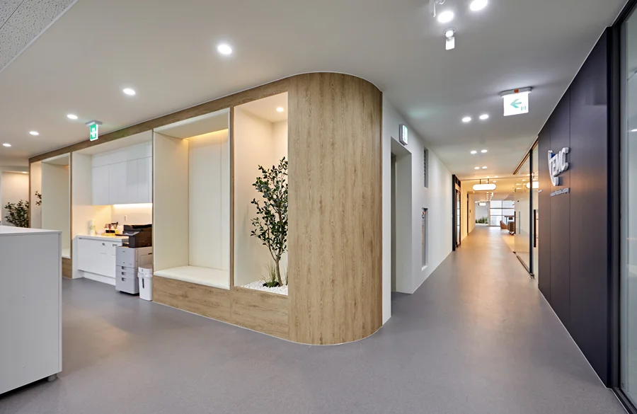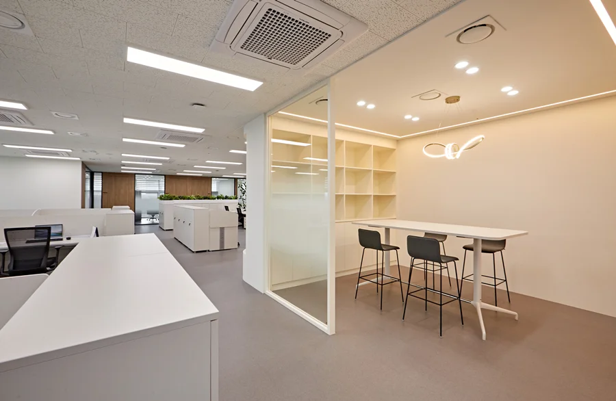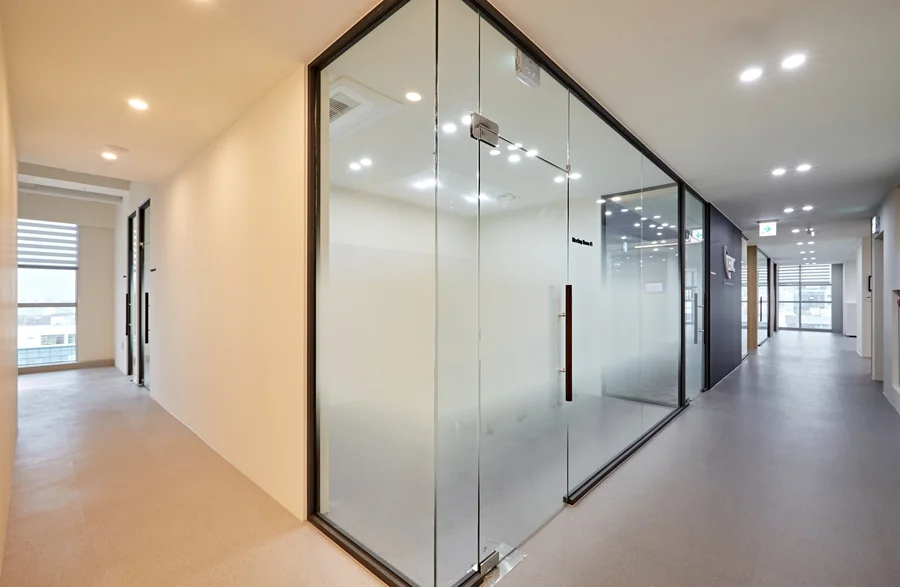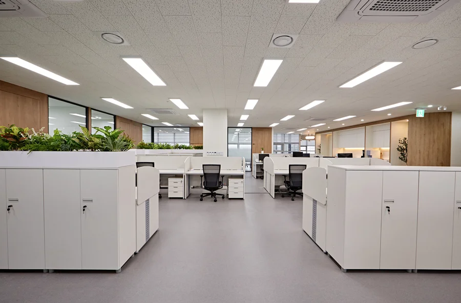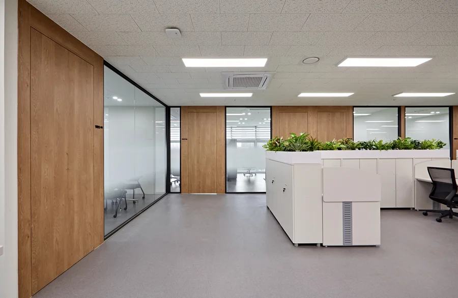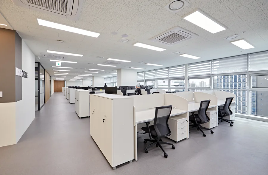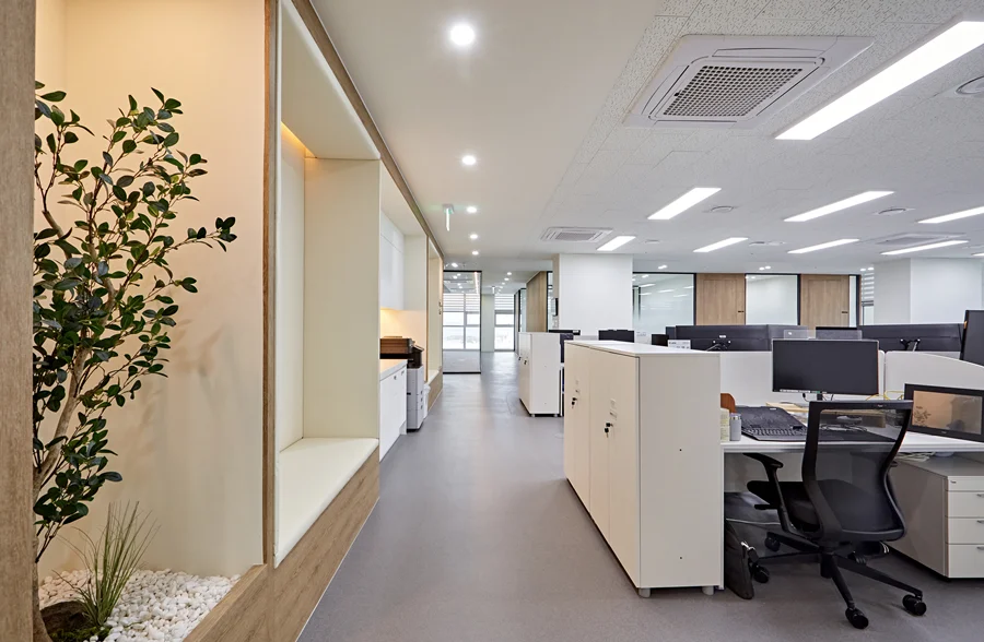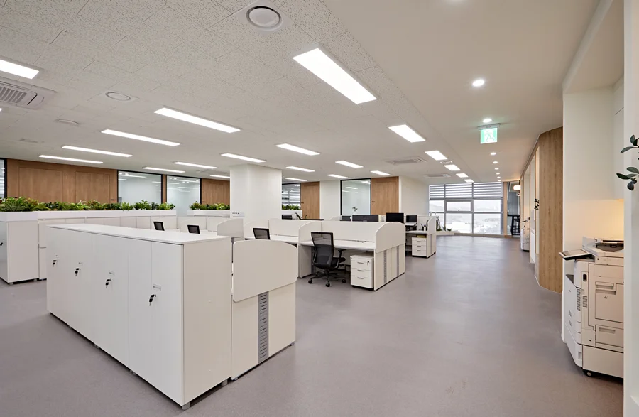지식산업센터의 핵심 공간인 오픈형 사무공간은 화이트 벽면과 우드톤 포인트 월, 그리고 유리 파티션으로 공간을 효율적으로 나누었습니다.