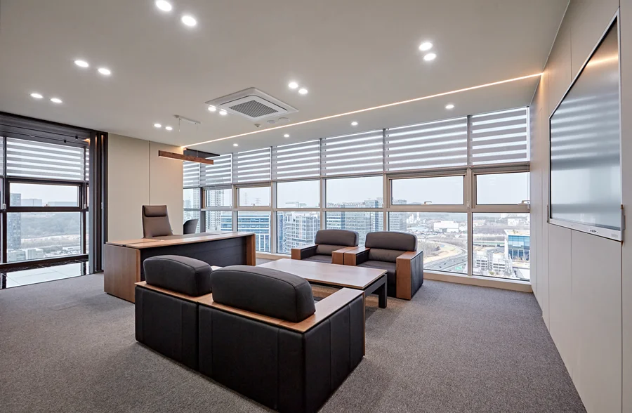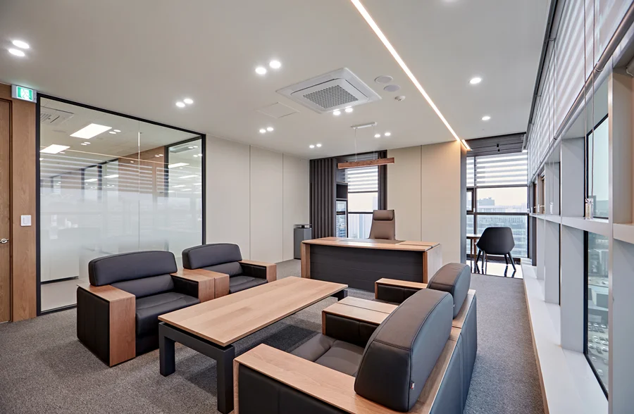 대표실은 우드 마감 벽체와 대형 데스크, 응접 소파 세트로 구성해 품격 있는 공간을 완성했습니다.