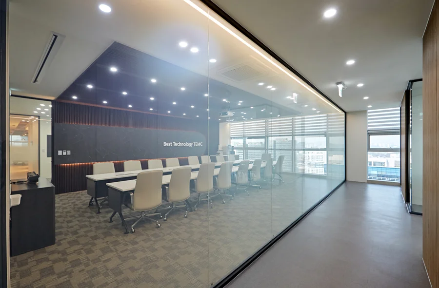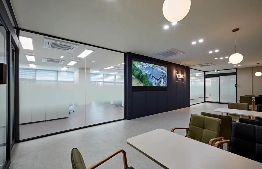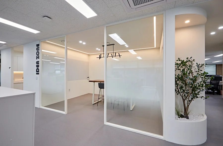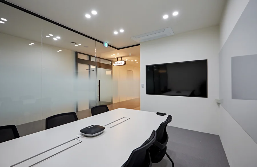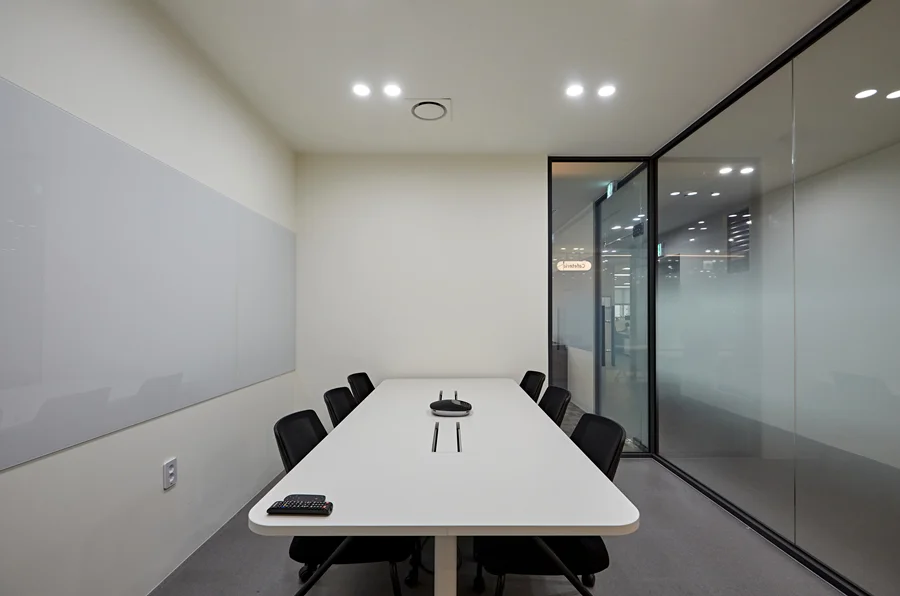회의실은 화이트 톤 벽면과 유리가벽으로 구성해 모던한 분위기를 강조했습니다.
