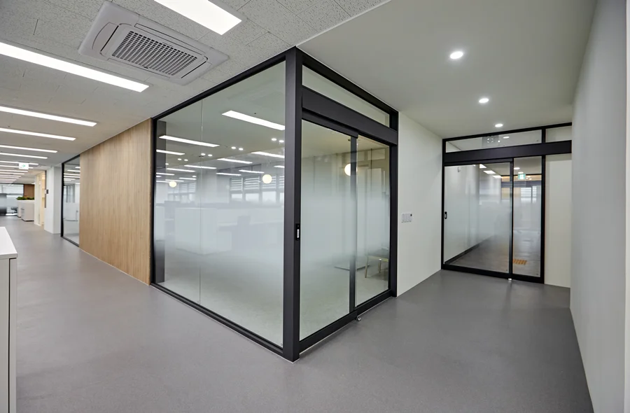 블랙 프레임 유리벽과 유리가벽 구조물 설치를 위해 미리 제작해 현장에서 조립하고, 오픈형 사무공간과 상담실의 파티션 구조도 목공으로 제작하였으며, 상담실과 회의실 벽체에는 단열재와 흡음재를 충진해 공간의 기능성과 방음 효과를 높여주었습니다.