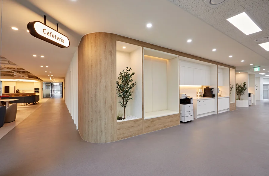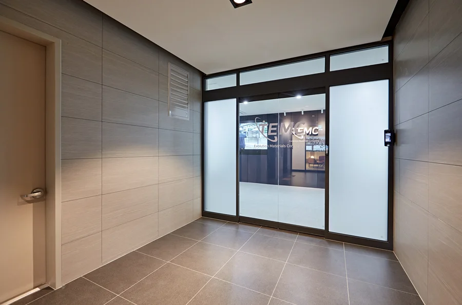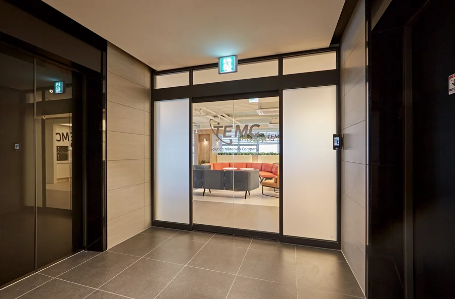 입구 안쪽으로는 기업 로고와 사인물을 심플하게 배치해 가시성을 확보했고, 외부에서는 내부가 은은하게 비쳐 깔끔하고 정돈된 인테리어를 엿볼 수 있어 고객의 기대감을 높였습니다.