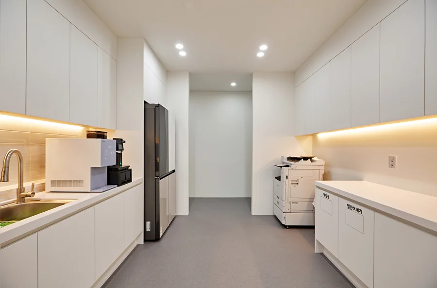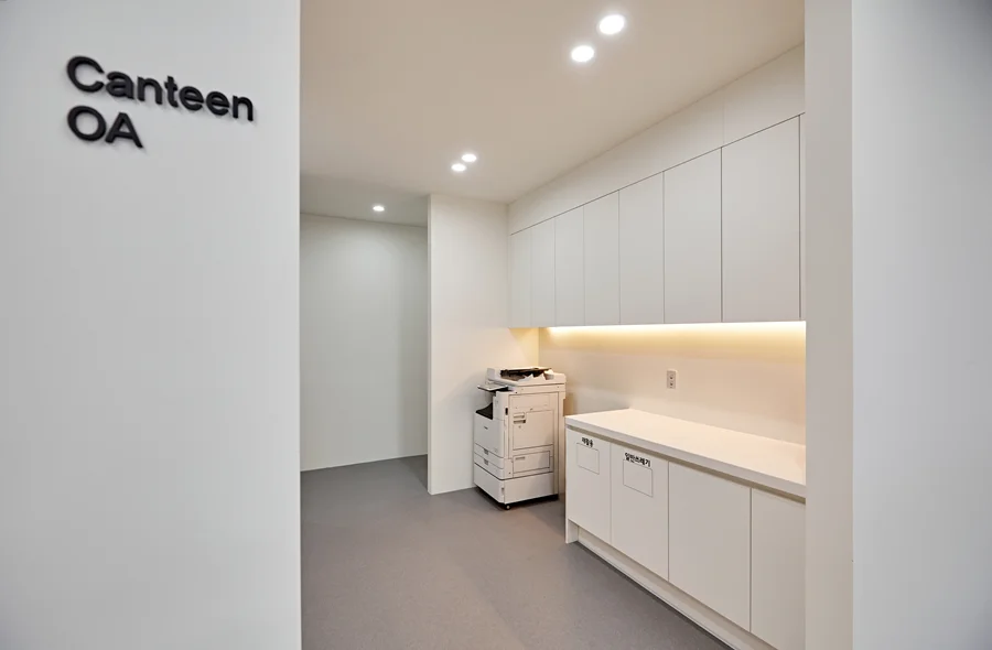 벽면 일부에는 유리가벽을 설치해 공간의 개방감을 주었으며, 천장에는 매입형 LED 조명과 펜던트 조명을 조화롭게 설치해 세련된 공간미를 살렸습니다.