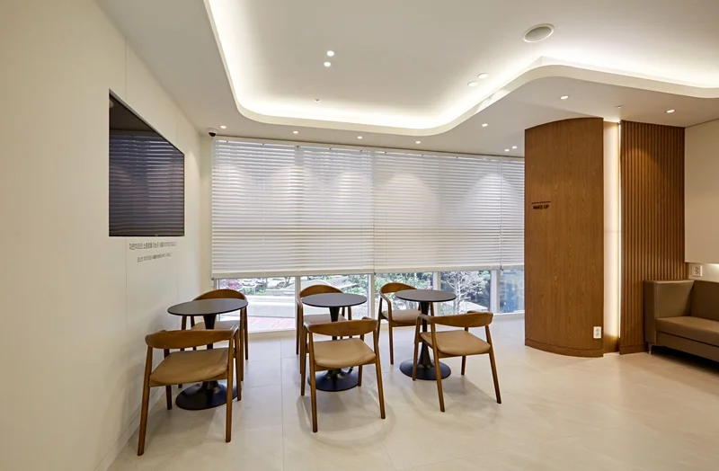 내부에는 화이트톤 상담 테이블과 우드체어, 포인트 조명을 배치해 고급스러움과 편안함을 더했습니다.