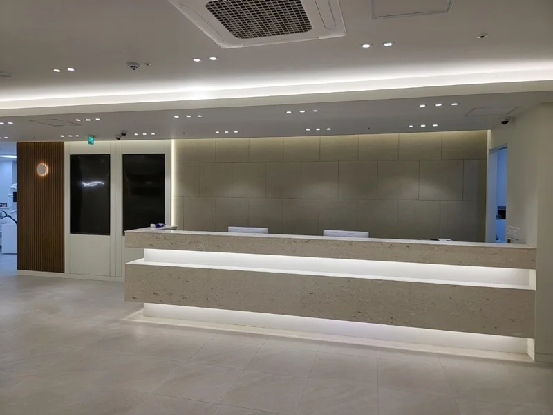리셉션 데스크는 화이트 인조대리석 상판과 우드 하부장으로 제작해 깔끔함과 따뜻함을 동시에 느낄 수 있게 했으며, 간접조명을 활용해 벽면 아트월에 포인트를 주어 공간의 깊이감을 살렸습니다.