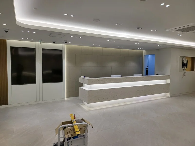 천장에는 라인 조명과 매립형 다운라이트를 조화롭게 배치해 로비 전체의 분위기를 은은하고 고급스럽게 완성했으며, 간결한 안내 사인물을 배치해 동선 안내도 효율적으로 설계했습니다.