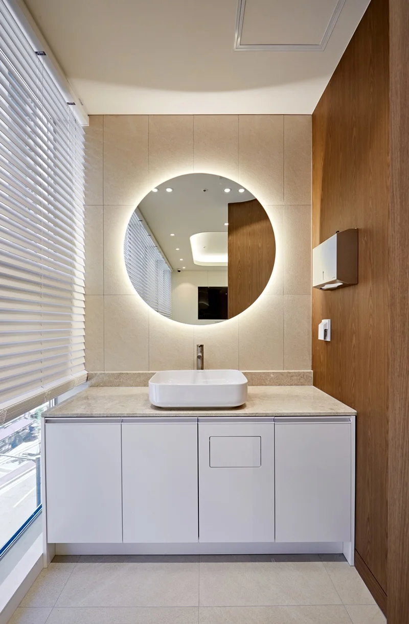 치과에서는 진료 전후 환자분들이 구강 관리를 할 수 있도록 양치 전용 세면대 공간이 필수적입니다. 이번 시공에서는 화이트 대리석 상판 세면대 조명 거울을 매치하여 깔끔하면서도 세련된 공간으로 완성했습니다.