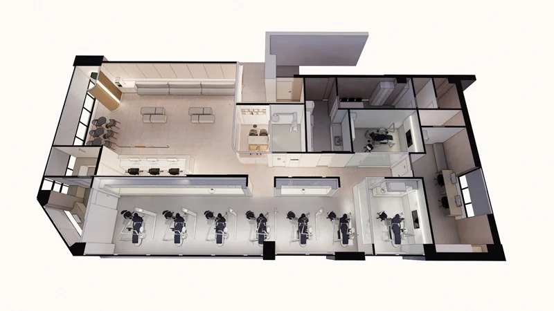 진료체어 간의 동선을 넓게 확보해 의료진과 환자 모두의 편의성을 높였고, 간접 조명과 스팟조명을 적절히 조합해 눈부심 없이 쾌적한 진료환경을 조성했습니다.
