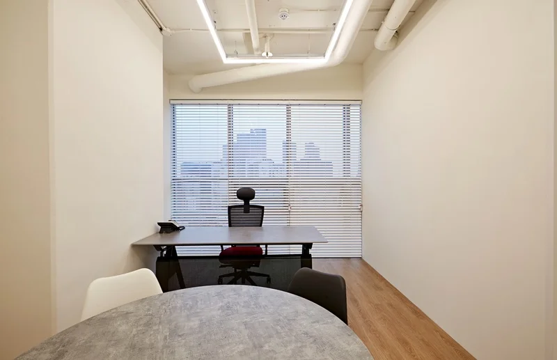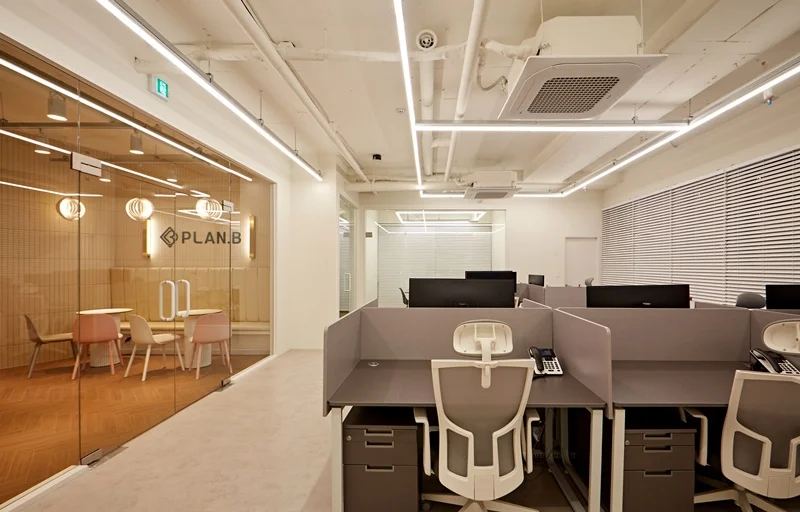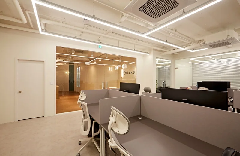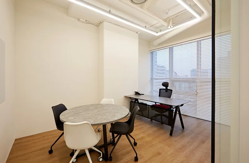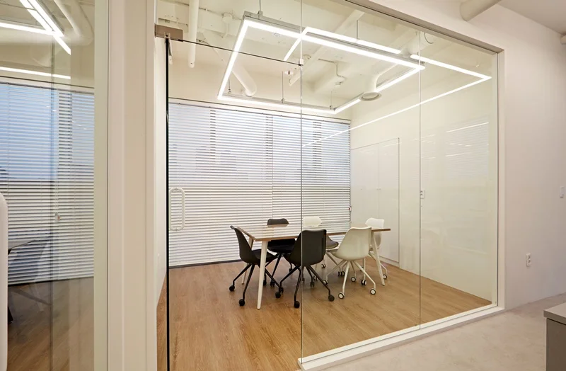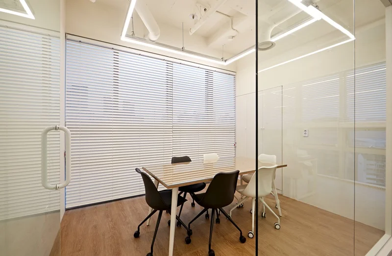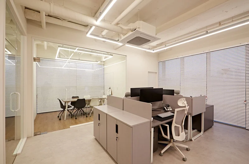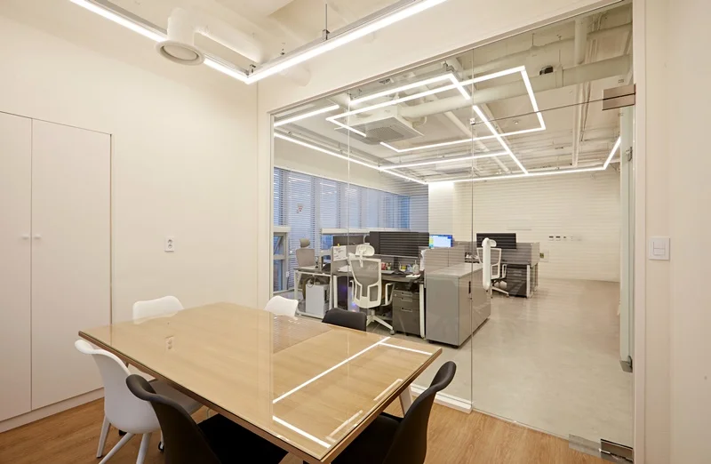 사무실 한쪽에는 유리가벽 회의실이 마련되어 있습니다. 투명 유리 파티션을 사용해 개방감을 유지하면서도, 내부는 독립된 회의 공간으로 활용할 수 있습니다. 이 공간은 집중 회의나 브레인스토밍 세션에 적합하며, 외부 손님을 맞이할 때도 전문적이고 세련된 이미지를 전달할 수 있습니다.