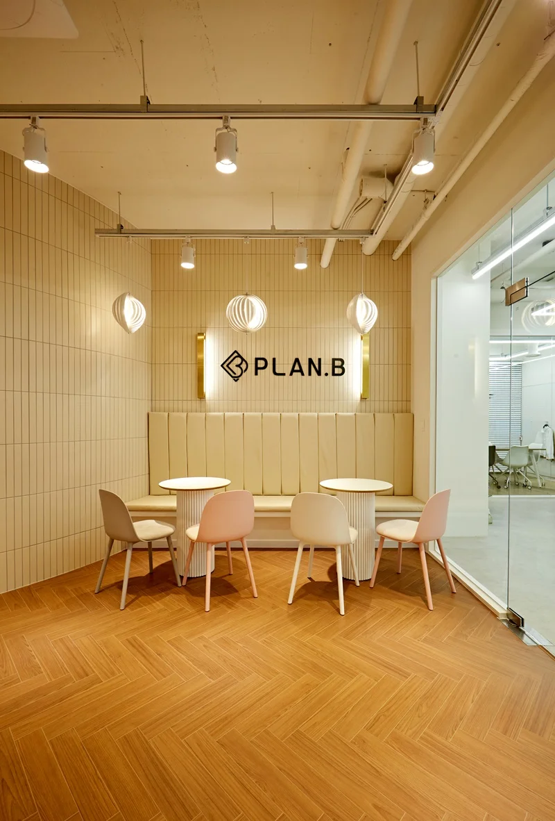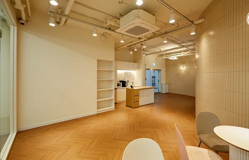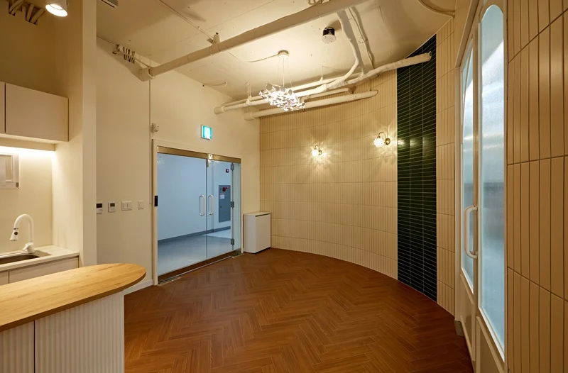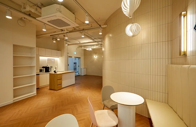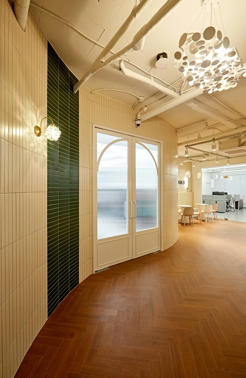사무실의 첫인상은 밝고 개방적이면서도 아늑한 느낌입니다. 우드 헤링본 패턴 바닥재와 따뜻한 베이지 톤 벽체가 안정감을 주며, 곳곳에 포인트 컬러로 사용된 그린 타일이 신선함을 더합니다. 천장은 일부 구조를 그대로 드러내는 오픈 천장 스타일로 마감하여 카페 같은 인더스트리얼 무드를 주었고, 다양한 형태의 조명이 조화롭게 배치되어 다채로운 공간감을 연출합니다.