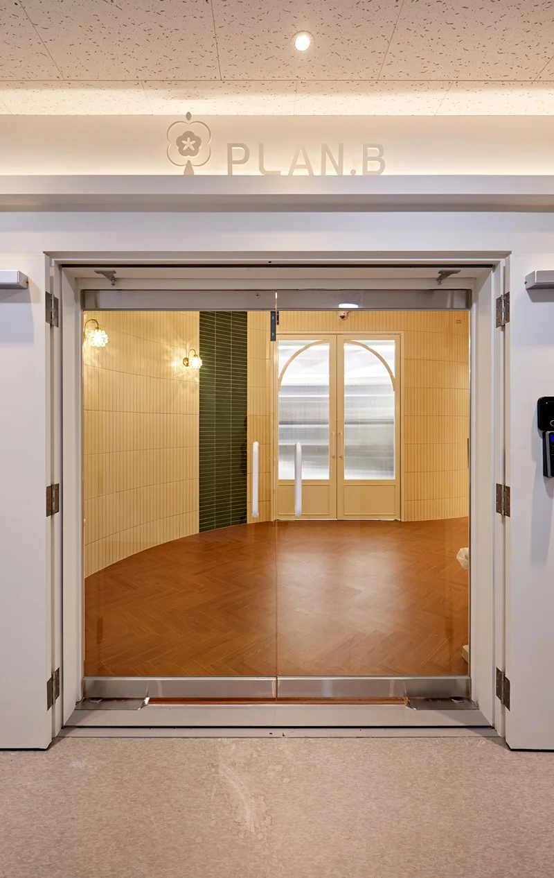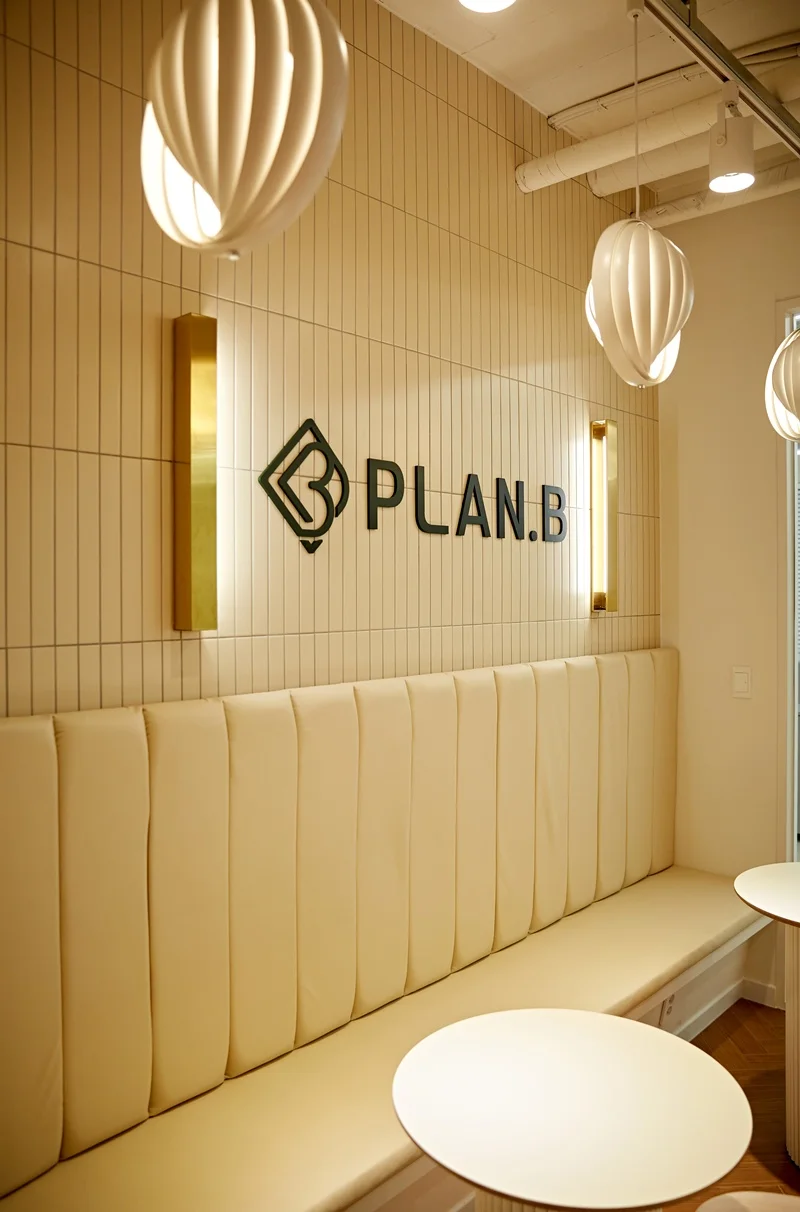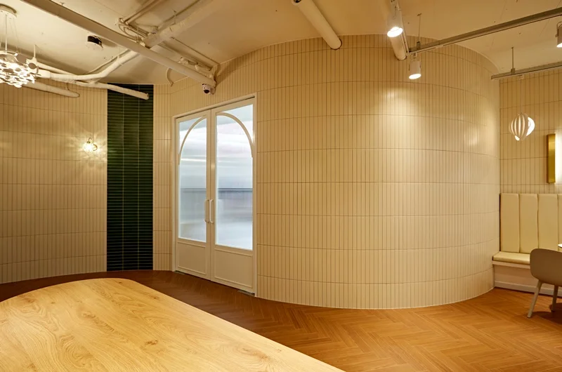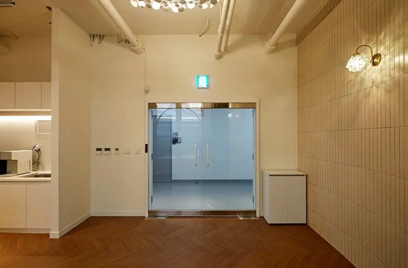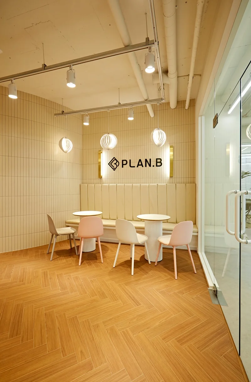 사무실의 첫인상은 밝고 개방적이면서도 아늑한 느낌입니다. 우드 헤링본 패턴 바닥재와 따뜻한 베이지 톤 벽체가 안정감을 주며, 곳곳에 포인트 컬러로 사용된 그린 타일이 신선함을 더합니다. 천장은 일부 구조를 그대로 드러내는 오픈 천장 스타일로 마감하여 카페 같은 인더스트리얼 무드를 주었고, 다양한 형태의 조명이 조화롭게 배치되어 다채로운 공간감을 연출합니다.