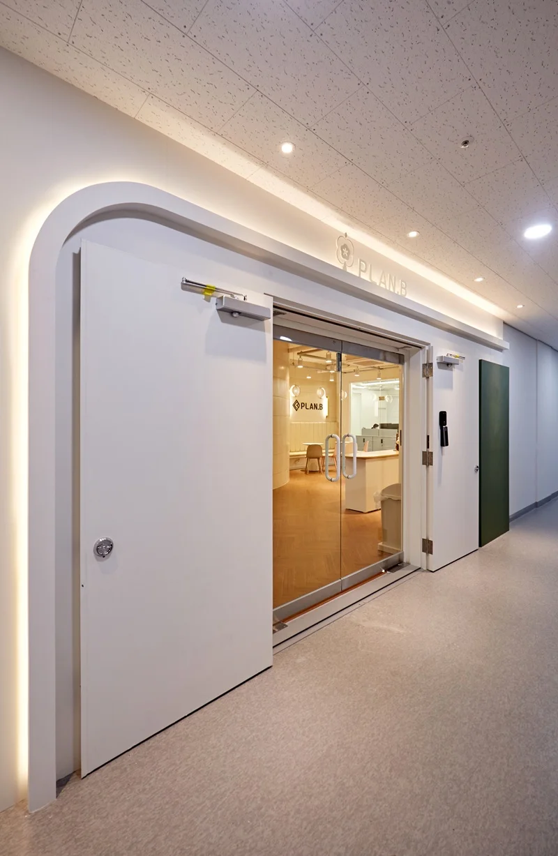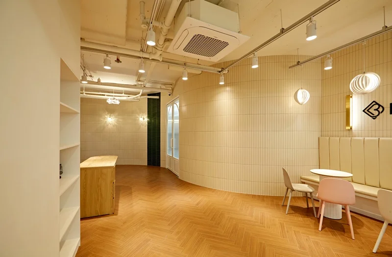 휴게공간 벽체는 곡선 형태로 시공하여 카페 같은 부드러운 분위기를 연출했습니다.